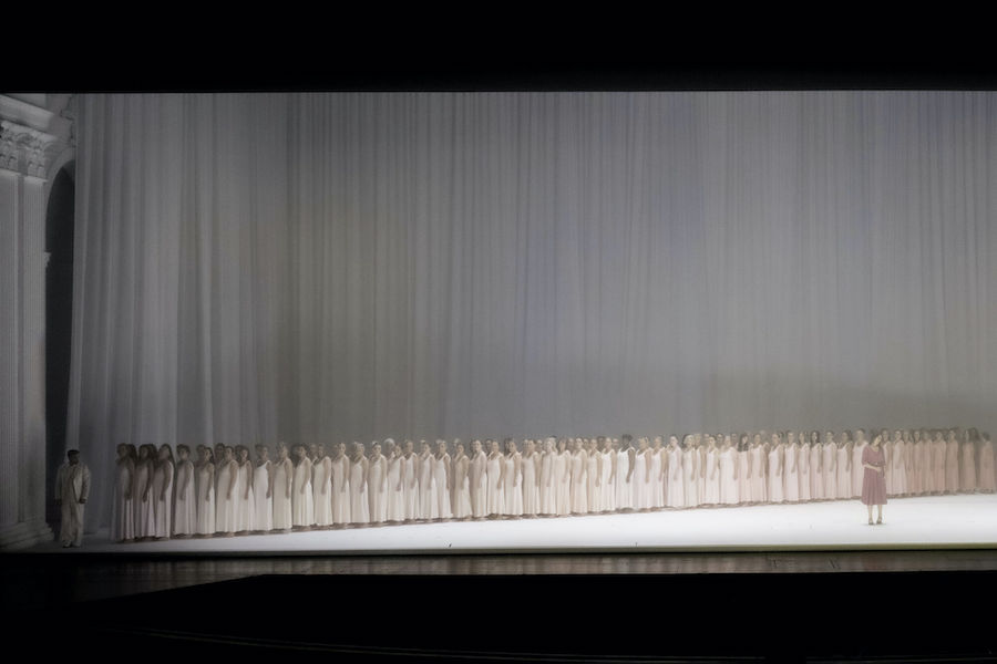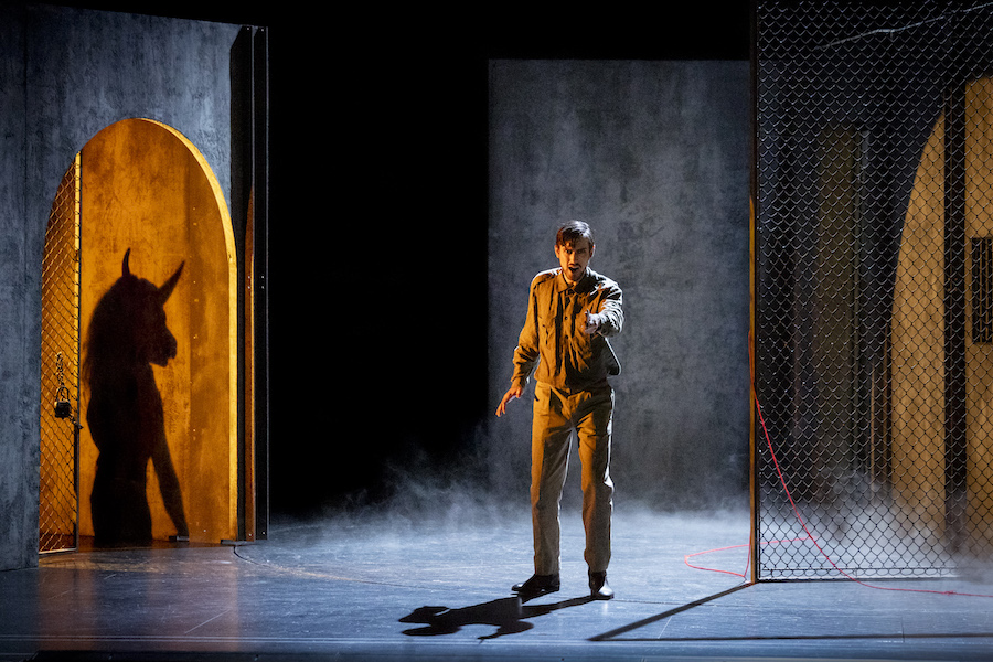 La presente produzione salisburghese de L’idiota è quella che potrebbe confermare il nome di Weinberg nella trilogia dei russi della seconda metà del Novecento, assieme a Prokof’ev e Šostakovič cioè. Lo fanno prevedere la qualità dello spettacolo affidato per la parte visiva a un altro polacco, Krzysztof Warlikowski che ambienta la vicenda nella Russia del passato presente. La scenografia della moglie Małgorzata Szczęśniak copre le arcate della Felsenreitschule con una lunghissima parete di legno in cui si inserisce uno schermo per la proiezione dei video di Kamil Polak e un ambiente aggettante chiuso, per le scene più intime. Pochi altri elementi occupano lo spazio immenso del palcoscenico che permette la compresenza di scene diverse. Concepito prima dell’invasione dell’Ucraina, lo spettacolo ha assunto un ulteriore significato, come scrive il regista: «Dostoevskij è una figura pericolosa. Non ha mai nascosto il suo lato antisemita, razzista, nazionalista, panslavo e, alla fine della sua vita, zarista. È la grande mente dietro l’immagine della Russia eterna, forte, dominante e oscura. Oscura e in conflitto con i valori dell’Europa occidentale. Sorprendenti sono le analogie con quanto sta accadendo dal 24 febbraio 2022, o più precisamente dall’occupazione di parte del Donbass e della Crimea nel 2014. Se il genio di Dostoevskij non fosse stato al servizio del nazionalismo, forse i russi non sarebbero diventati gli autori di tutto ciò che hanno commesso nel corso del XX secolo e di ciò che vediamo oggi in Ucraina».
