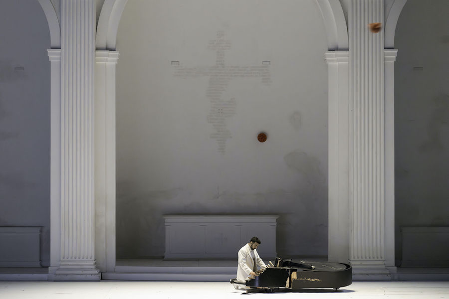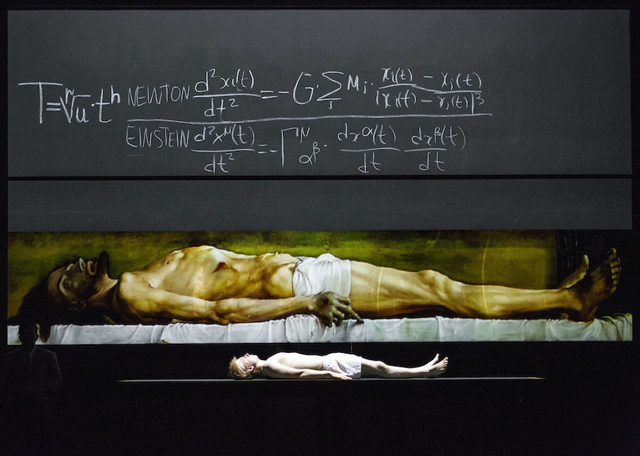 A contrasto di tutto ciò è la figura dell’“idiota”, che non ha nulla in comune con gli altri, che siano persone fondamentalmente oneste o irrimediabilmente malvagie. Candido, incorrotto, incapace di mentire, Myškin è convinto di poter cambiare le persone e salvare il mondo: «Non entro in gioco», scriverà a un certo punto sulla lavagna e dirà che la bellezza non è morta, è solo passata di moda. La sua diversità solitaria è la stessa del compositore, ebreo polacco perseguitato sia dal nazismo che dallo stalinismo, un uomo che a causa delle proprie vicissitudini ha ragionato sulle questioni esistenziali e filosofiche poste dal romanzo di Dostojevskij. «L’idiota è Cristo?» si chiede Warlikowski, e prima di lui molti altri. La risposta è positiva secondo il regista, che a un certo punto mostra il Principe dopo un attacco della sua malattia disteso come Il corpo di Cristo morto nella tomba nel realistico dipinto di Hans Holbein il Giovane del 1521.