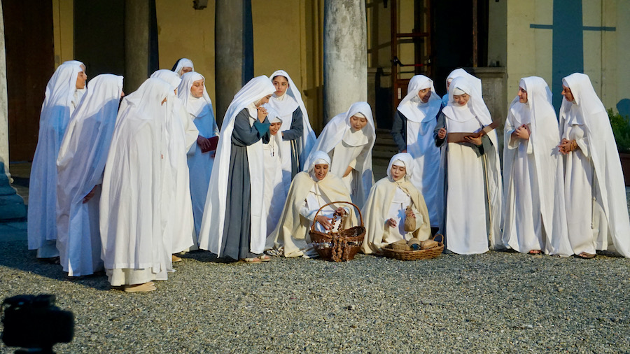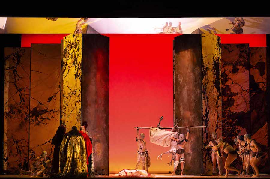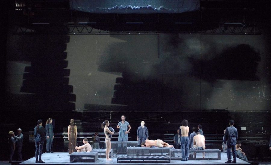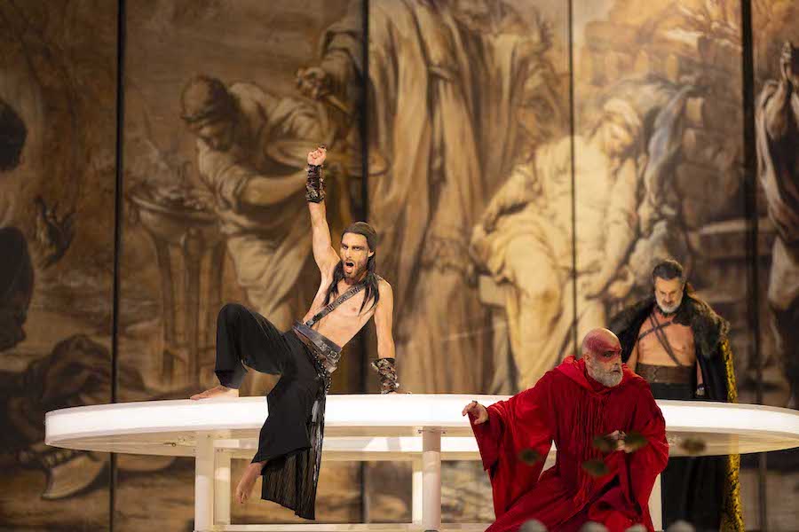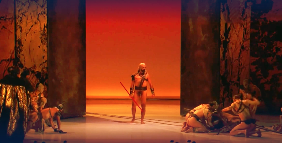 La messa in scena di Max Emanuel Cenčić, oltre che cantante e regista anche Direttore del Festival, è in stile contemporaneo ma evocativa di un’atmosfera arcaica: durante l’ouverture, classicamente tripartita, viene narrato l’antefatto dell’uccisone del cervo sacro a Diana da parte di Agamennone e dei suoi soldati che entrano in scena nudi dalla vita in giù, questo per accentuare l’aspetto ferino e barbaro dei greci. Il nudo maschile non è una novità nell’opera ultimamente, ma era dai tempi dell’Ercole sul Termodonte di Spoleto che non venivano messi così in bella vista attributi maschili non solo per i figuranti: il regista non si è tirato indietro, dando lui stesso l’esempio.