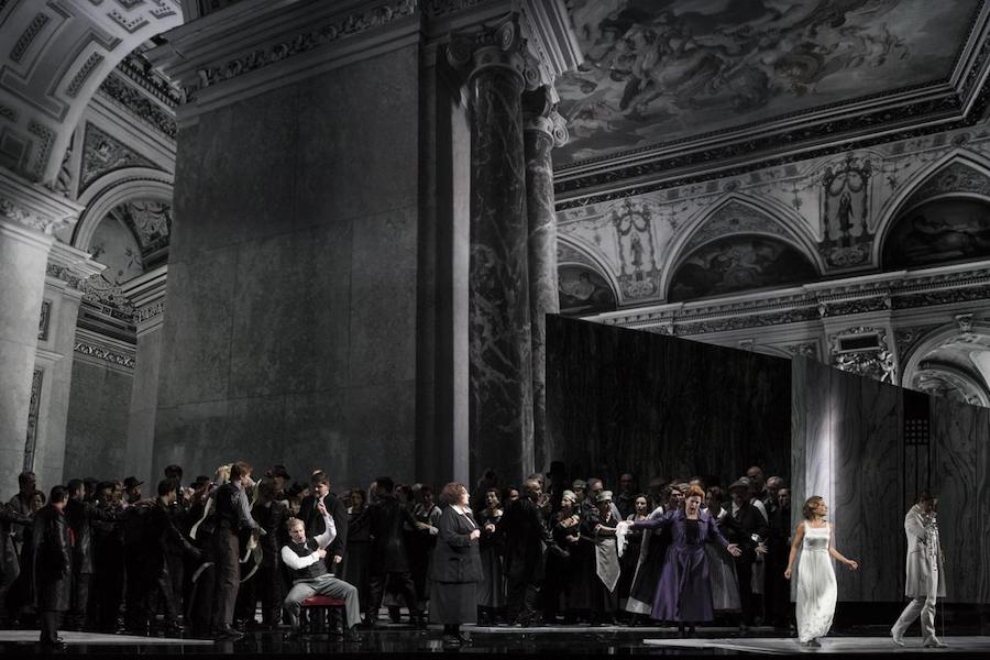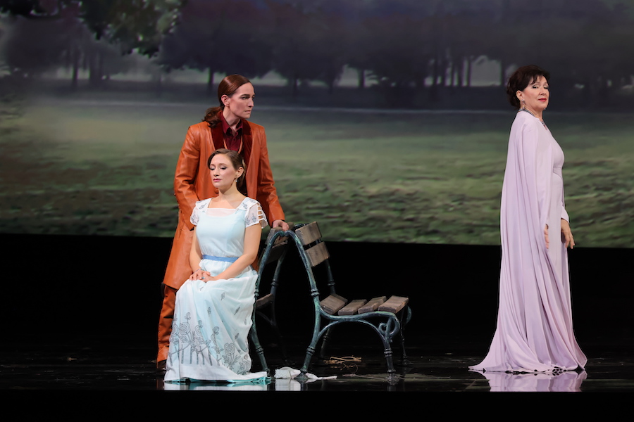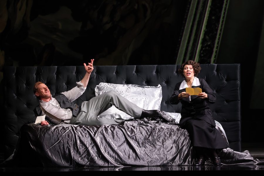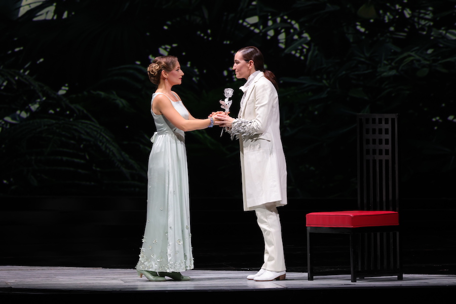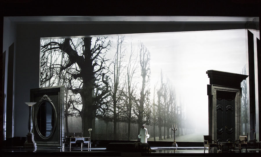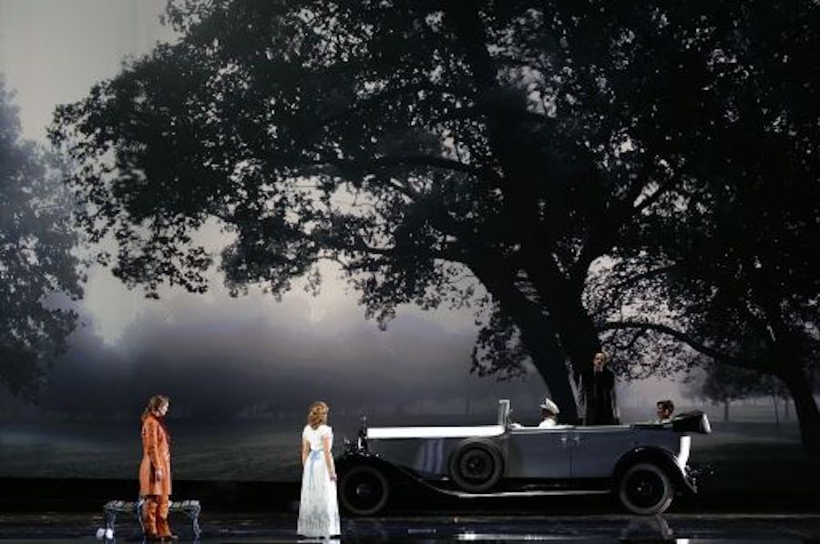L’allestimento è dunque quello del 2016 di Harry Kupfer qui ripreso da Derek Gimpel, con le scenografie di Hans Schavernoch delle gigantografie in bianco e nero degli edifici più noti della capitale austriaca, i costumi di Yan Tax che mescolano le epoche, e le luci crepuscolari di Jürgen Hoffmann. Allora venne giudicato essenziale, elegante, ripulito da parrucche e riccioli rococo su cui si erano concentrati gli allestimenti tradizionali fino ad allora, con poche eccezioni. Dopo gli scorci architettonici della Hofburg i cui saloni sono ripresi dal basso come per esprimere il senso di impotenza dei personaggi, si insinuano le immagini dei parchi nebbiosi e di un viale alberato nei rigori dell’inverno contemplato da una Marescialla in preda ai suoi dubbi esistenziali. Coloratissimo e fin troppo sgargiante è invece il Prater del terzo atto, con la balena che troneggia sul localino scelto dallo squattrinato Ochs per il suo rendez-vous con la domestica. Una grande porta, un letto e uno specchio, poche sedie, una panchina, una elegantissima Rolls-Royce dei primi ‘900: pochi elementi per definire l’opulenza di questa società in declino in un’epoca, quella appena precedente la Grande Guerra, ugualmente instabile quanto quella del regno di Maria Teresa d’Asburgo (1740-1780) scelto da Hofmannsthal per il suo libretto.