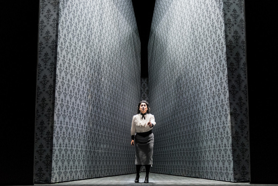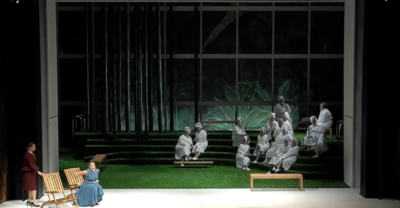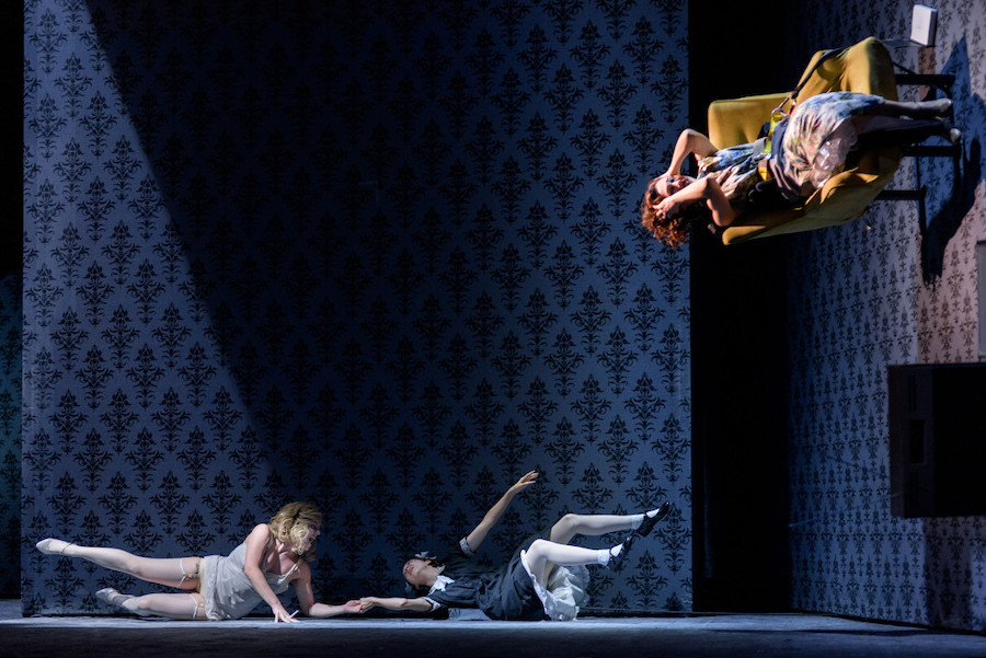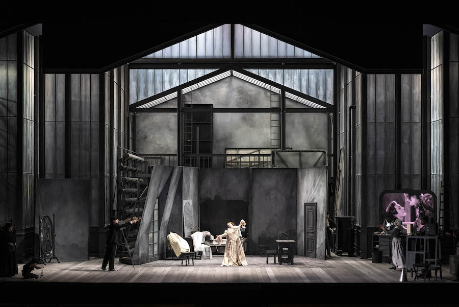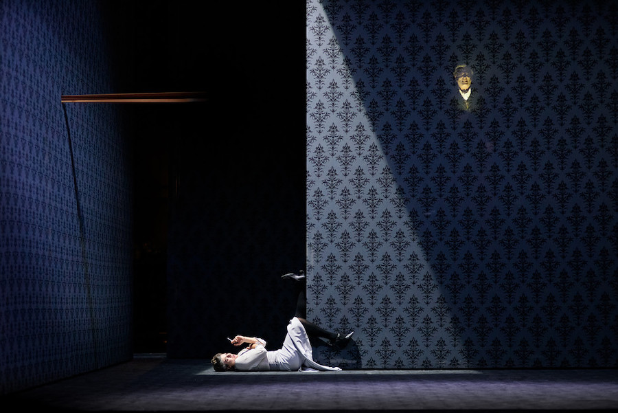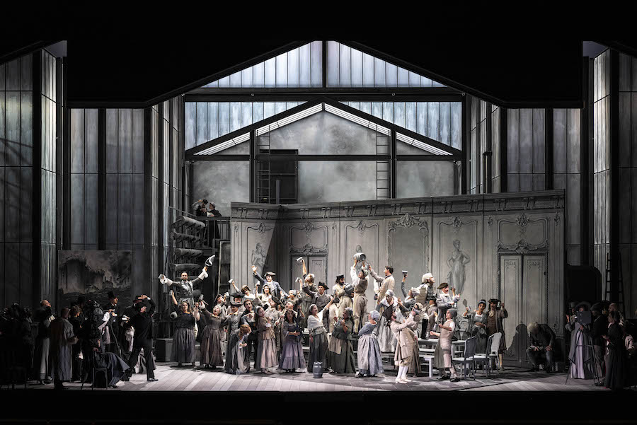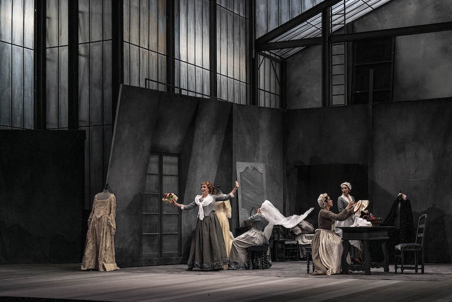 L’allestimento è dunque quello del 2016 di Harry Kupfer qui ripreso da Derek Gimpel, con le scenografie di Hans Schavernoch delle gigantografie in bianco e nero degli edifici più noti della capitale austriaca, i costumi di Yan Tax che mescolano le epoche, e le luci crepuscolari di Jürgen Hoffmann. Allora venne giudicato essenziale, elegante, ripulito da parrucche e riccioli rococo su cui si erano concentrati gli allestimenti tradizionali fino ad allora, con poche eccezioni. Dopo gli scorci architettonici della Hofburg i cui saloni sono ripresi dal basso come per esprimere il senso di impotenza dei personaggi, si insinuano le immagini dei parchi nebbiosi e di un viale alberato nei rigori dell’inverno contemplato da una Marescialla in preda ai suoi dubbi esistenziali. Coloratissimo e fin troppo sgargiante è invece il Prater del terzo atto, con la balena che troneggia sul localino scelto dallo squattrinato Ochs per il suo rendez-vous con la domestica. Una grande porta, un letto e uno specchio, poche sedie, una panchina, una elegantissima Rolls-Royce dei primi ‘900: pochi elementi per definire l’opulenza di questa società in declino in un’epoca, quella appena precedente la Grande Guerra, ugualmente instabile quanto quella del regno di Maria Teresa d’Asburgo (1740-1780) scelto da Hofmannsthal per il suo libretto.