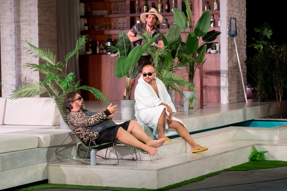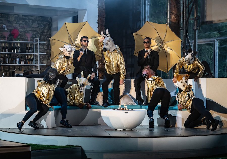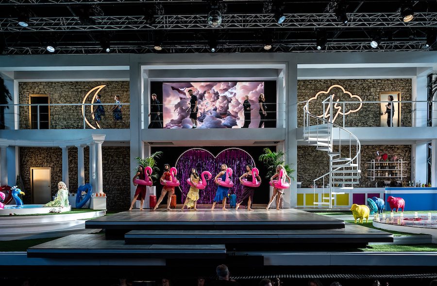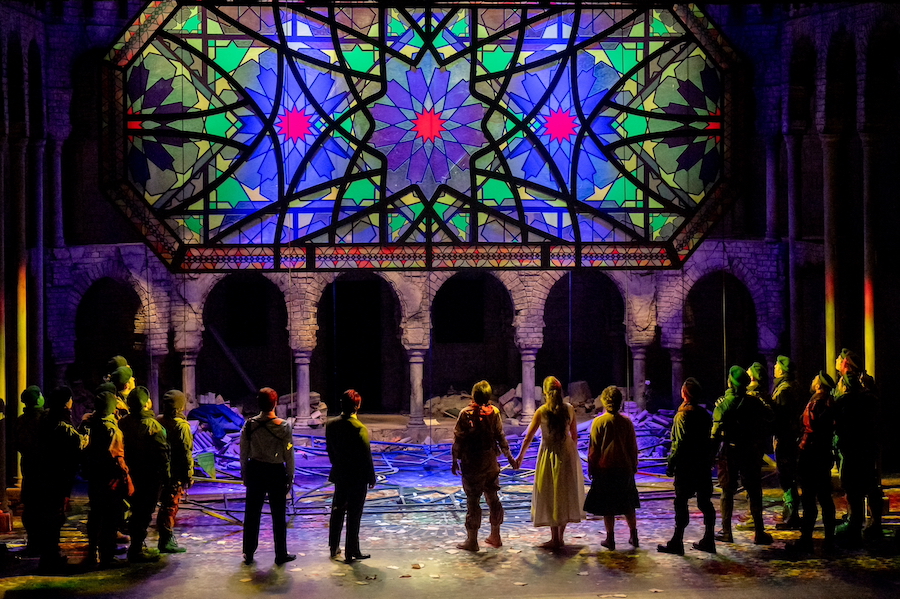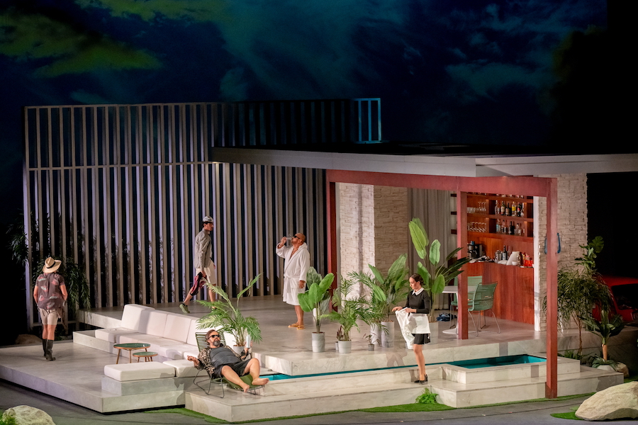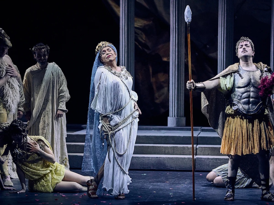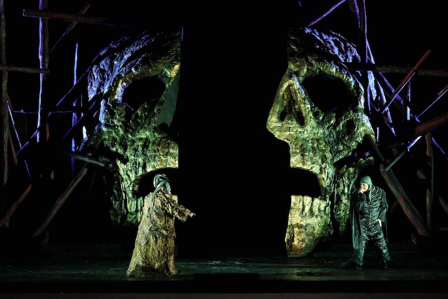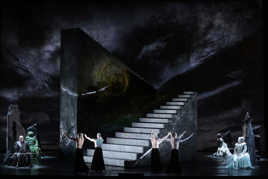 Ambientata in un non-tempo arcaico, la scenografia, firmata dal regista stesso e da Hannah Postlethwaite, si basa su pochi elementi altamente simbolici, primo fra tutti quello delle mani che vediamo sul fondo del fiume mentre fanno da supporto alle evoluzioni delle figlie del Reno. Mani monumentali che ricordano quelle gigantesche viste a Bregenz nella Carmen di Holten e nel Rigoletto di Stölzl. Nella seconda scena il mondo degli dèi gira attorno a una scala che non conduce da nessuna parte, simile a un monumento funebre, sulla solita piattaforma rotante, mentre il Nibelheim contiene un teschio costruito con l’oro estratto dai nani minatori. Altre mani, che hanno faticato per costruire il Walhall, sono quelle fuori misura dei giganti, mentre la mano rapace di Alberich si staglia dipinta all’interno di un cerchio nell’immagine proiettata sul sipario. Simbolo meno evidente è la presenza delle braccia roteanti che trasformano Loge in una vogueing dea Kalì. Inquietante è poi il giovane nudo che impersonifica (!) l’oro del Reno, violato da Alberich per poi comparire alla fine dell’opera tutto sanguinolento.