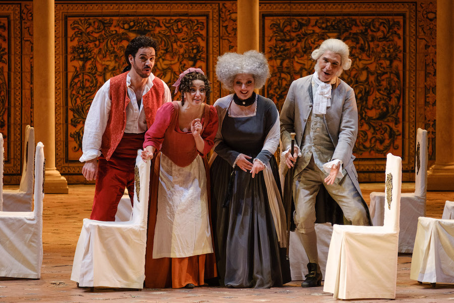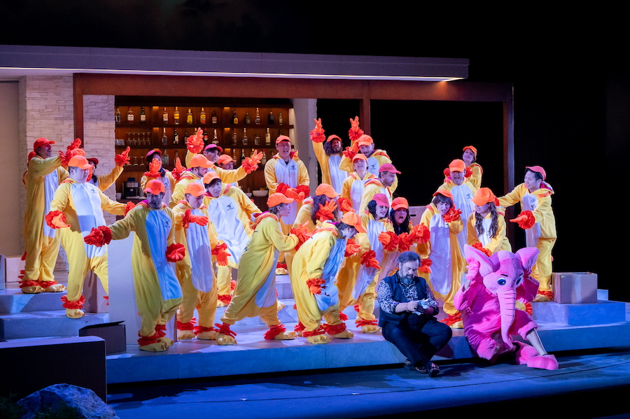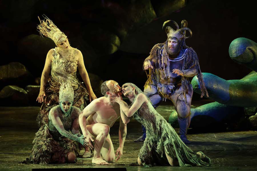 Il timbro sgradevole e la linea di canto frammentata del Loge di Norbert Ernst procurano all’interprete impietosi buu da parte del pubblico che probabilmente vuole esprimere il dissenso per la resa caricaturale della sua parte, ma anche qui la colpa non è del povero cantante che fa le spese di una scelta registica non compresa. Okka von der Damerau e Olga Bezsmertna danno voce a Fricka e Freia, la prima con bella intensità espressiva e la seconda con timbro fresco e luminoso. Esemplare è il Mime di Wolfgang Ablinger-Sperrhacke, il miglior attore in scena, veterano della parte cantata con efficacia in innumerevoli produzioni. I due giganti Fasolt e Fafner, su trampoli e sormontati da mascheroni, trovano nelle voci di Jongmin Park e Ain Anger la giusta autorevolezza, soprattutto il primo più umano e dolente nella sua infatuazione per Freia mentre il secondo ha espressione più rude e scomposta. Magnifici i fratelli Donner e Froh, rispettivamente Andrè Schuen dal timbro sontuoso e Siyabonga Maqungo dal bel tono lirico e luminoso. Vocalmente inappuntabili e distinte per personalità vocale le tre voci delle figlie del Reno: Andrea Carroll (Woglinde), Svetlina Stoyanova (Wellgunde) e Virginie Verrez (Flosshilde).