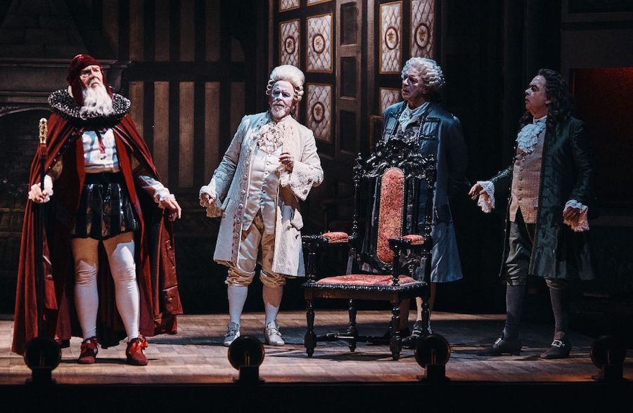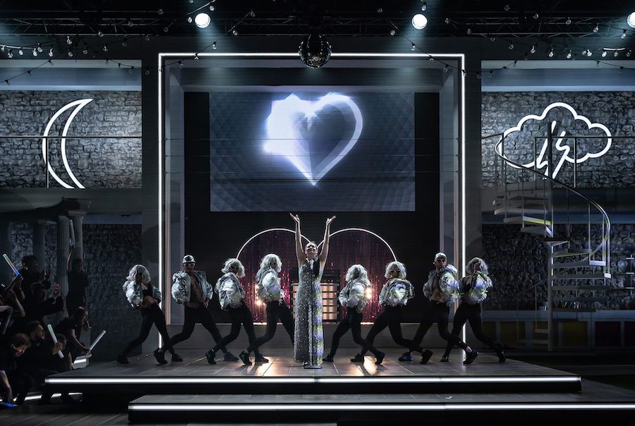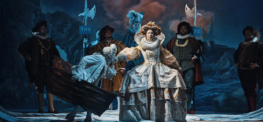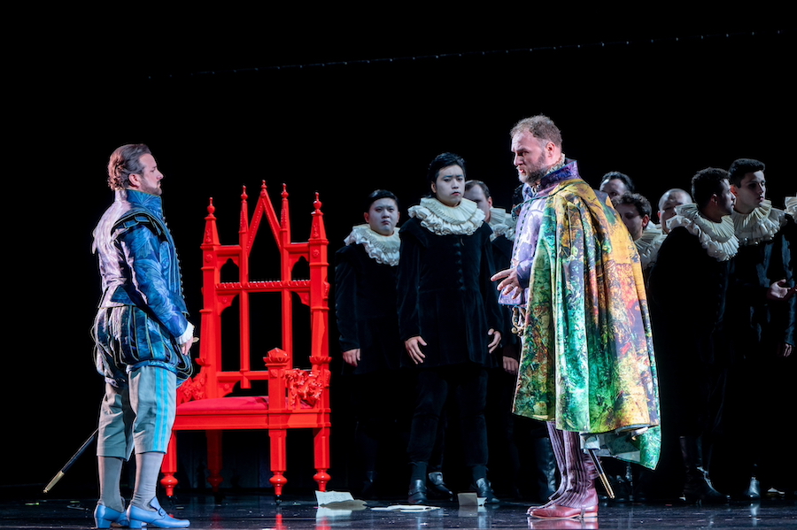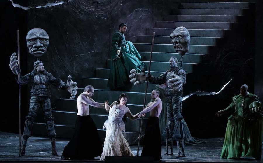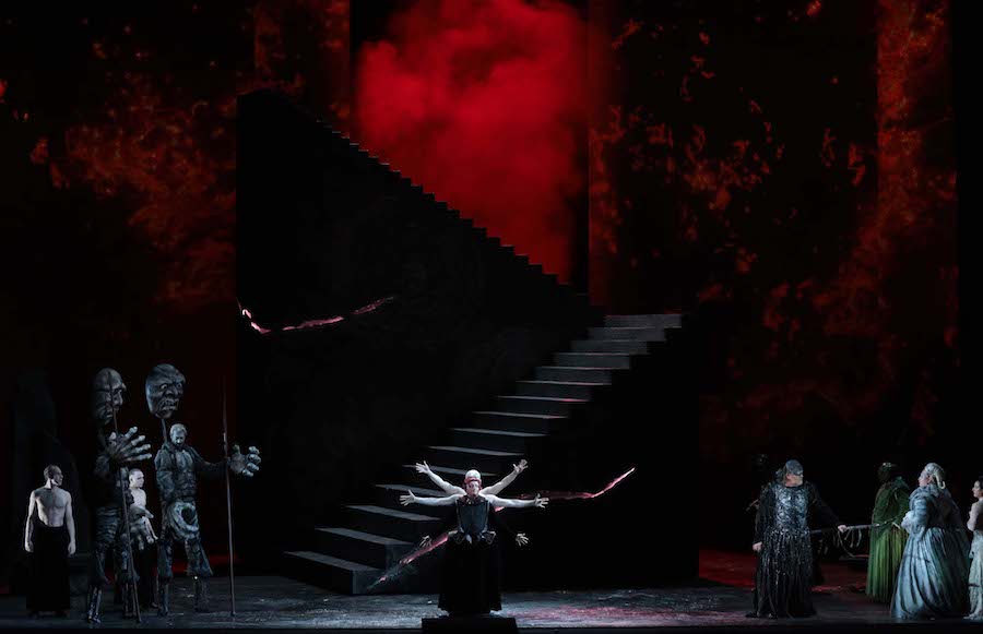 Nella lettura di McVicar il mito delle leggende nordiche si trasforma in un universo fantasy piuttosto kitsch nei costumi di Emma Kingsbury, che mette le gonne a tutti gli dèi e tende ad allargare a dismisura le forme di chi li indossa, con effetti (in)volontariamente ridicoli nel caso di Froh, una via di mezzo tra una rana che sta per scoppiare e una allegra comare di Windsor taglia XXXL. Anche sulla regia attoriale questa volta il regista scozzese manca il segno affidandosi quasi esclusivamente alle capacità dei singoli e alla presenza di servi muti/ballerini che riempiono i meravigliosi interludi orchestrali con insulsi movimenti davanti al sipario o accompagnano personaggi altrimenti impediti nei movimenti come i giganti. Essenziale in uno spettacolo come questo è il ruolo delle luci, qui ben realizzate da David Finn. Banali invece i video di Katy Tucker: prima del colpo di Donner – che tra l’altra vibra il suo martellone sulla scalinata appena terminata! – si vedono dei nuvoloni subito seguiti da delle luci boreali per l’arcobaleno. Delle coreografie di Gareth Mole mi sono già espresso.