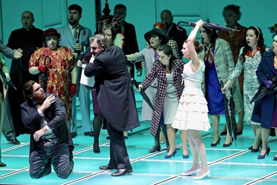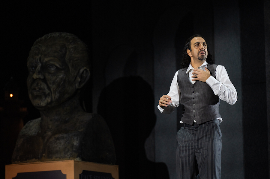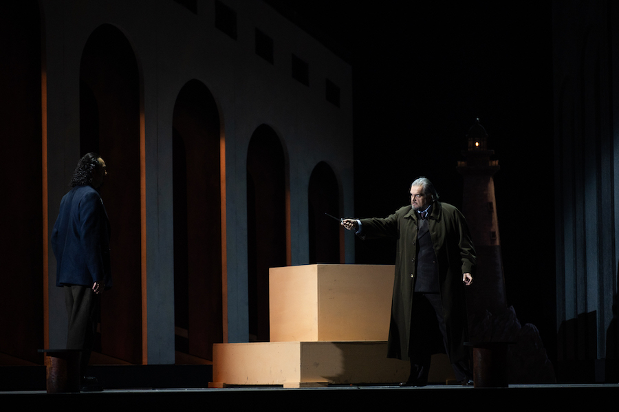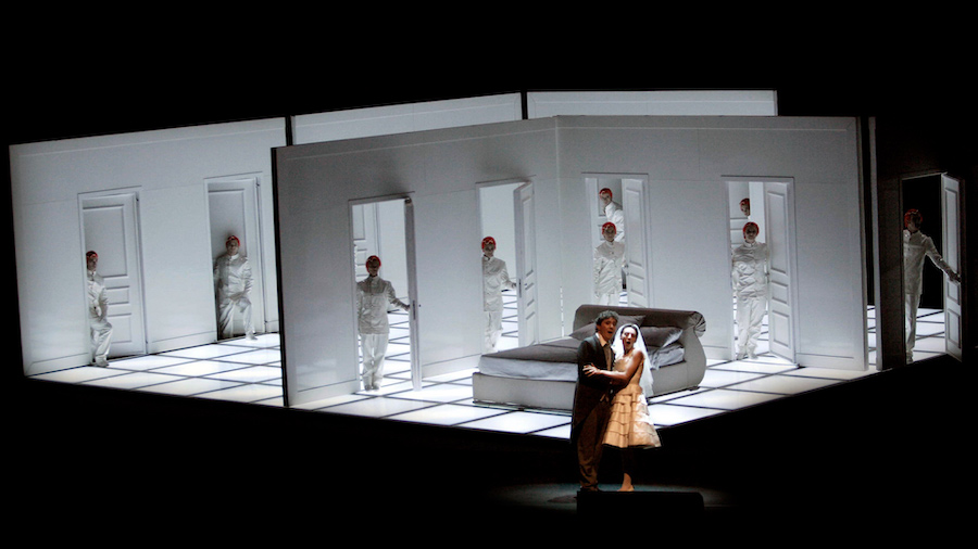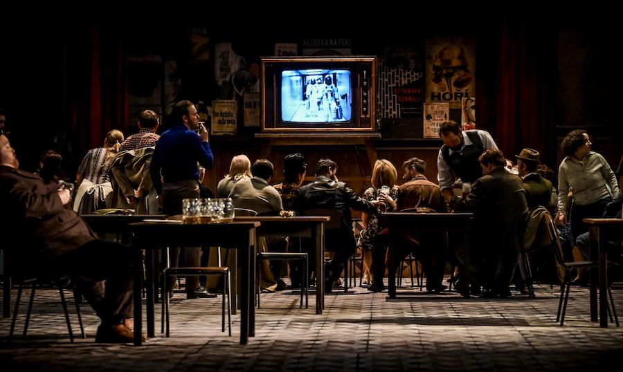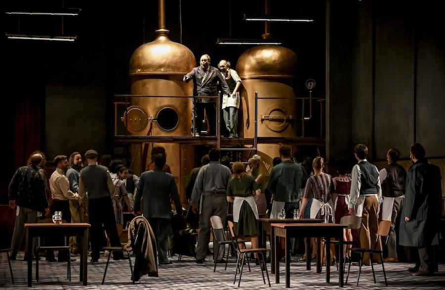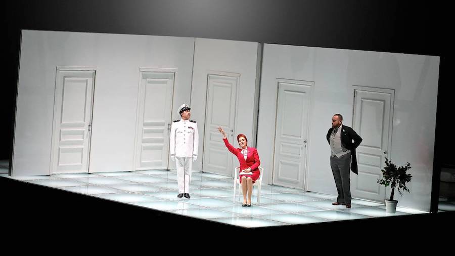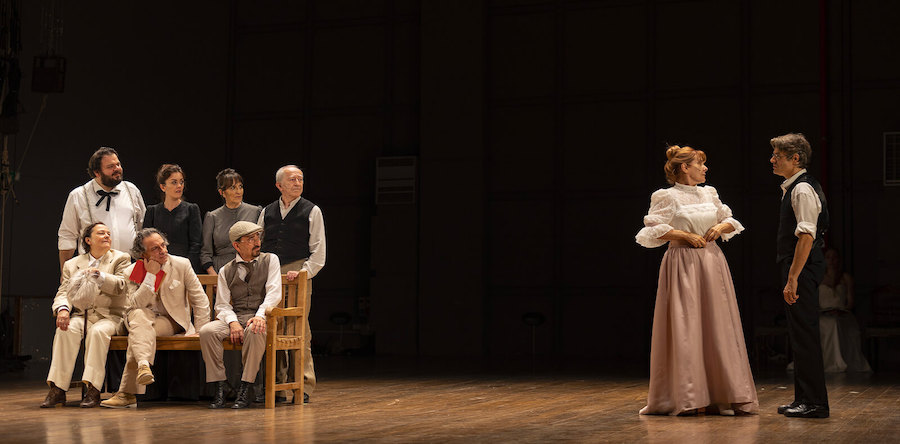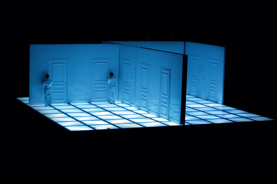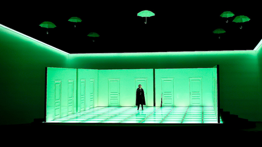Entrando nella sala del Carignano, il progetto sonoro di Antonio Della Ragione forma un primo impatto per il pubblico, quello acustico: un fondale continuo di suoni che creano un’atmosfera straniante, quasi onirica, alla David Lynch. Il sipario è già aperto sulla scenografia di Roberto Crea: il giardino dell’albergo con le piante in vaso, una passerella metallica sopraelevata e un pannello di velatino che occulta oppure lascia passare la vista di quanto succede dietro. Con le luci di Pasquale Mari i colori sono lividi. Nel secondo atto l’abitazione del mago Marvuglia è una Wunderkammer inondata di luce calda, nel terzo l’appartamento di Spelta è un ambiente vuoto e semibuio, un luogo della mente più che uno spazio reale.