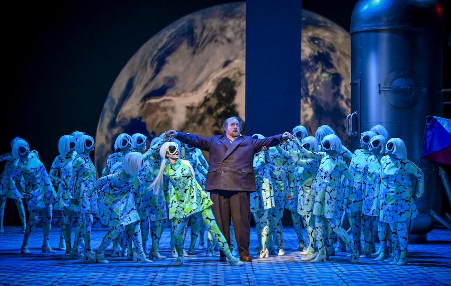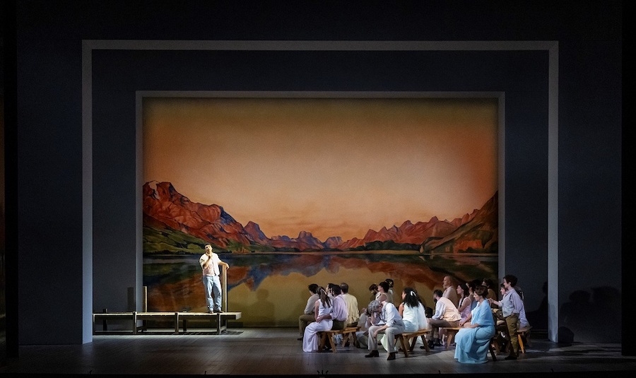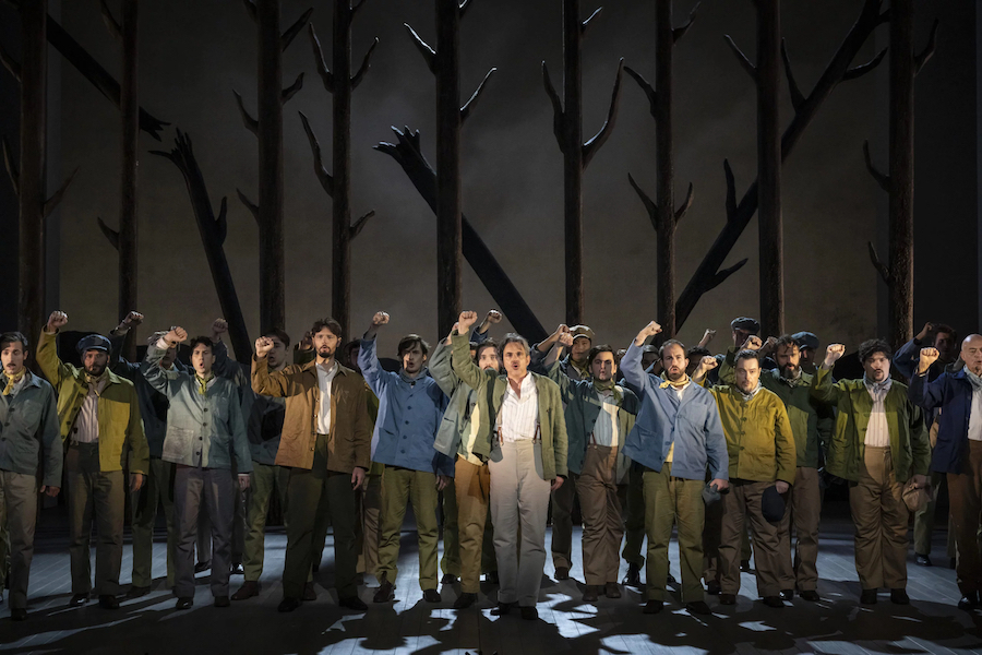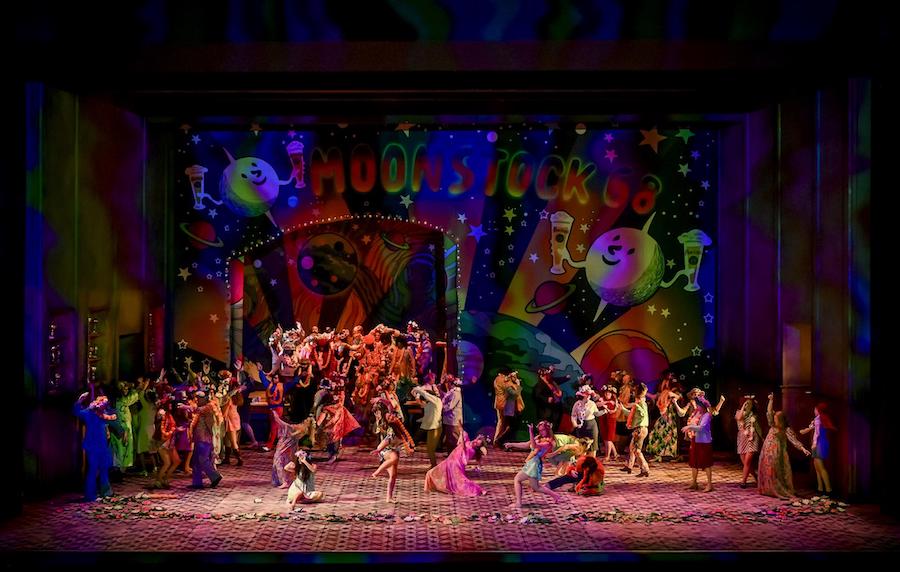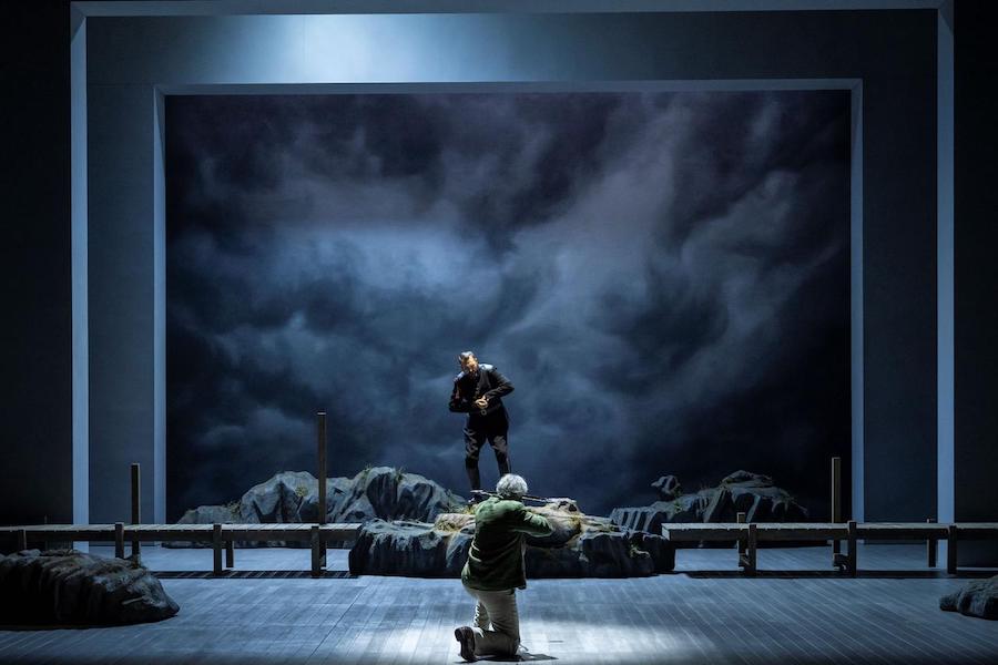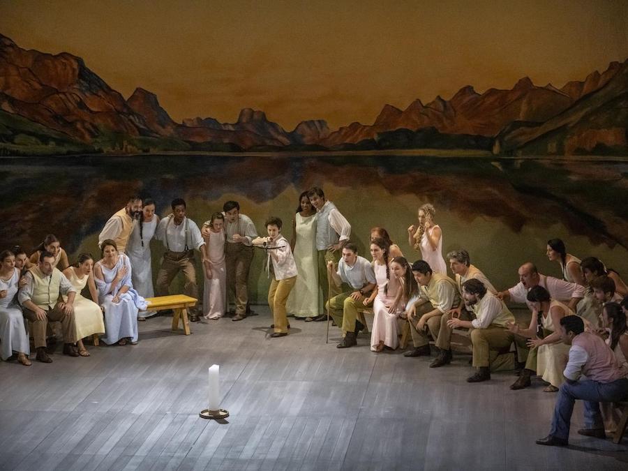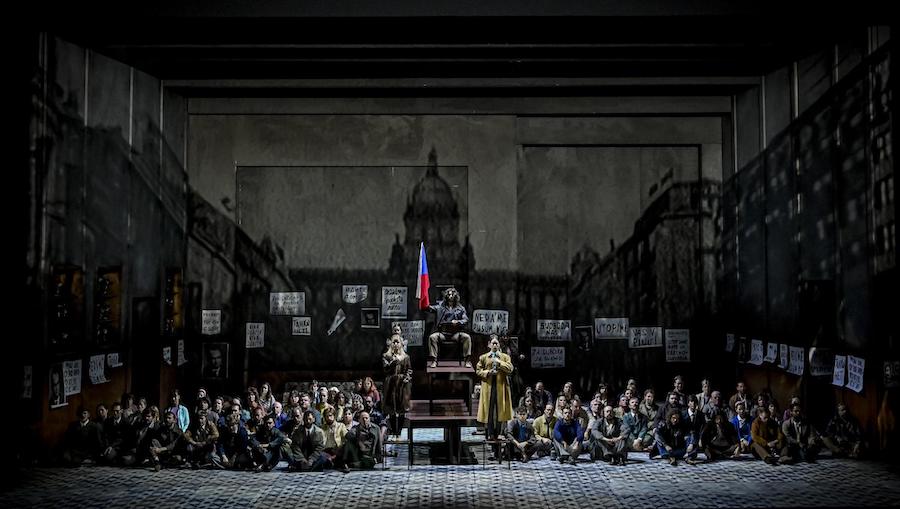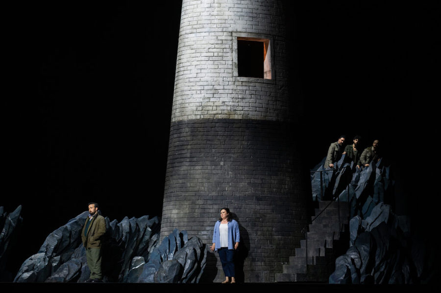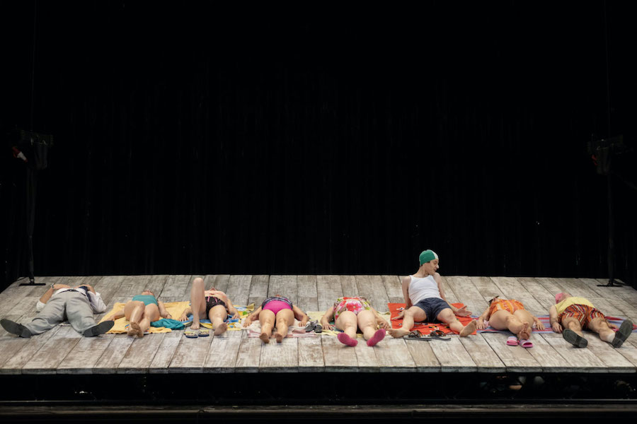 Entrando nella sala del Carignano, il progetto sonoro di Antonio Della Ragione forma un primo impatto per il pubblico, quello acustico: un fondale continuo di suoni che creano un’atmosfera straniante, quasi onirica, alla David Lynch. Il sipario è già aperto sulla scenografia di Roberto Crea: il giardino dell’albergo con le piante in vaso, una passerella metallica sopraelevata e un pannello di velatino che occulta oppure lascia passare la vista di quanto succede dietro. Con le luci di Pasquale Mari i colori sono lividi. Nel secondo atto l’abitazione del mago Marvuglia è una Wunderkammer inondata di luce calda, nel terzo l’appartamento di Spelta è un ambiente vuoto e semibuio, un luogo della mente più che uno spazio reale.