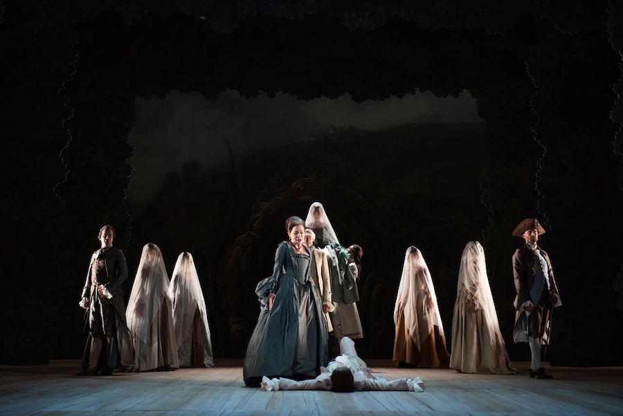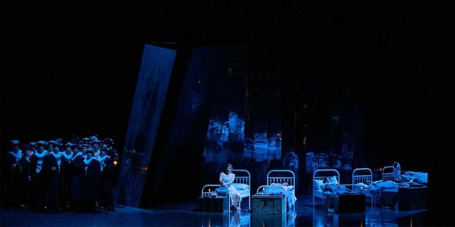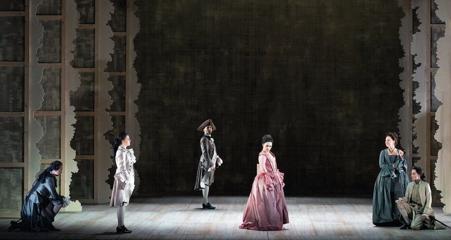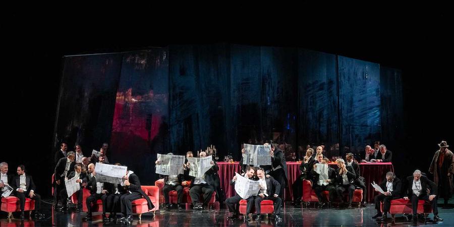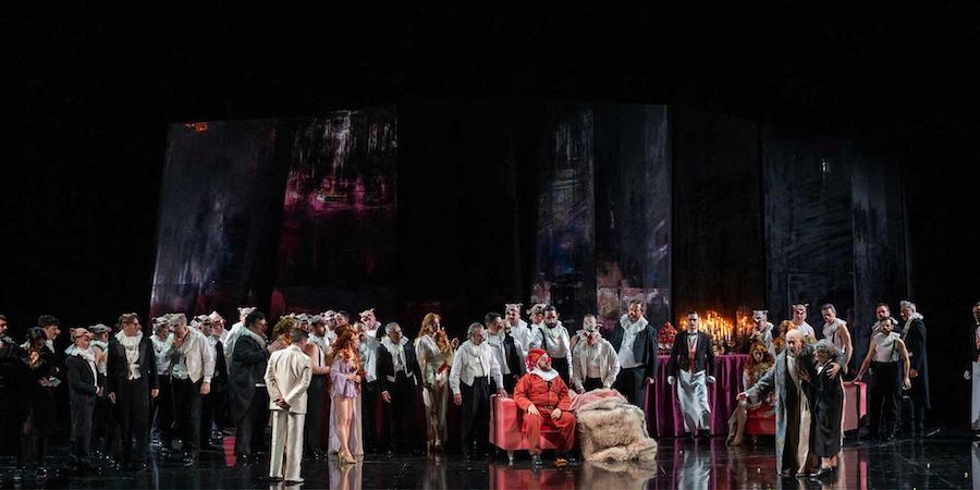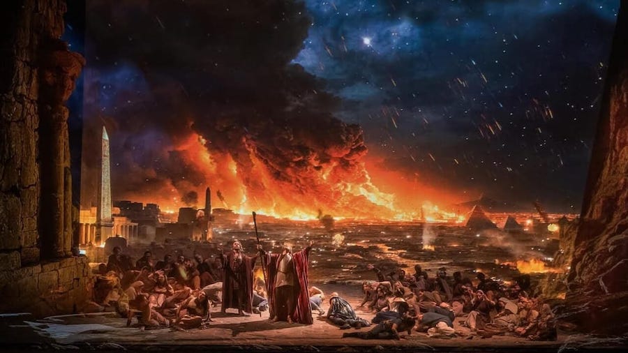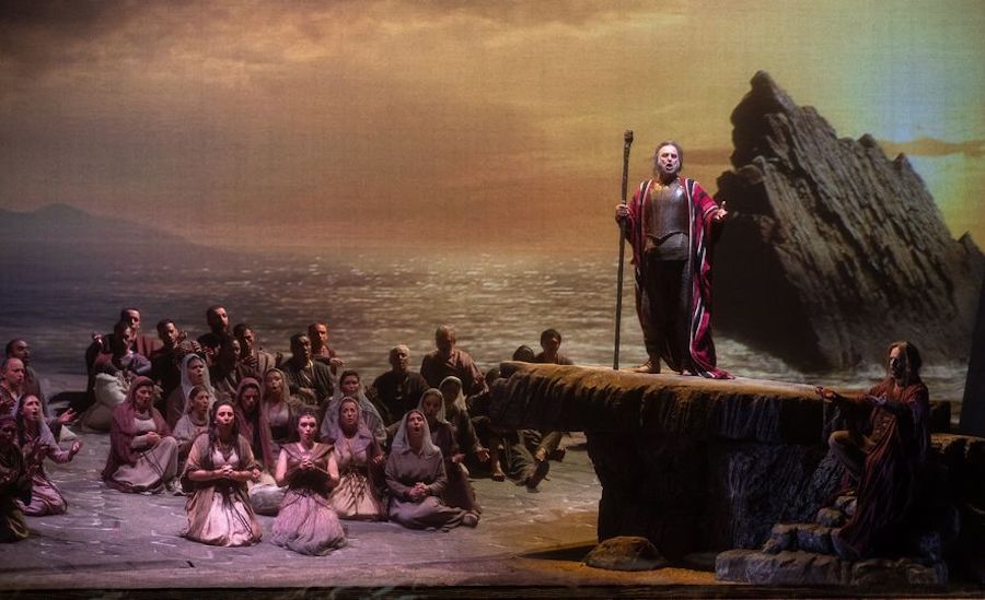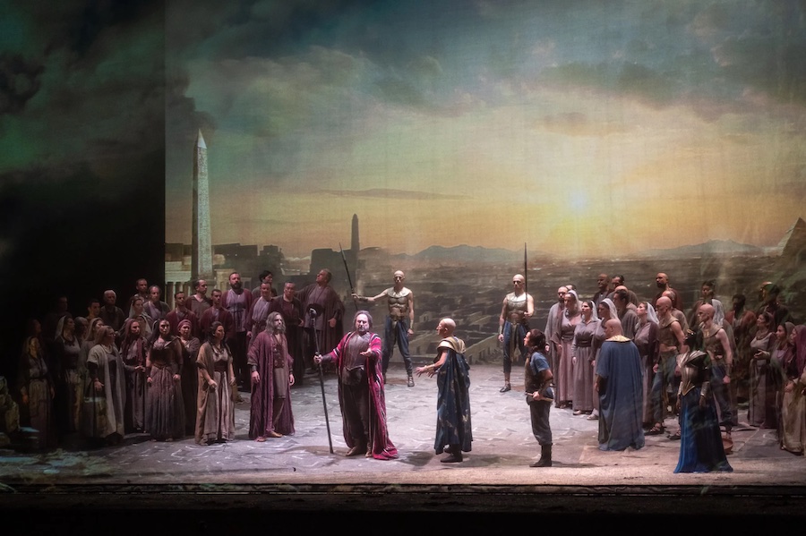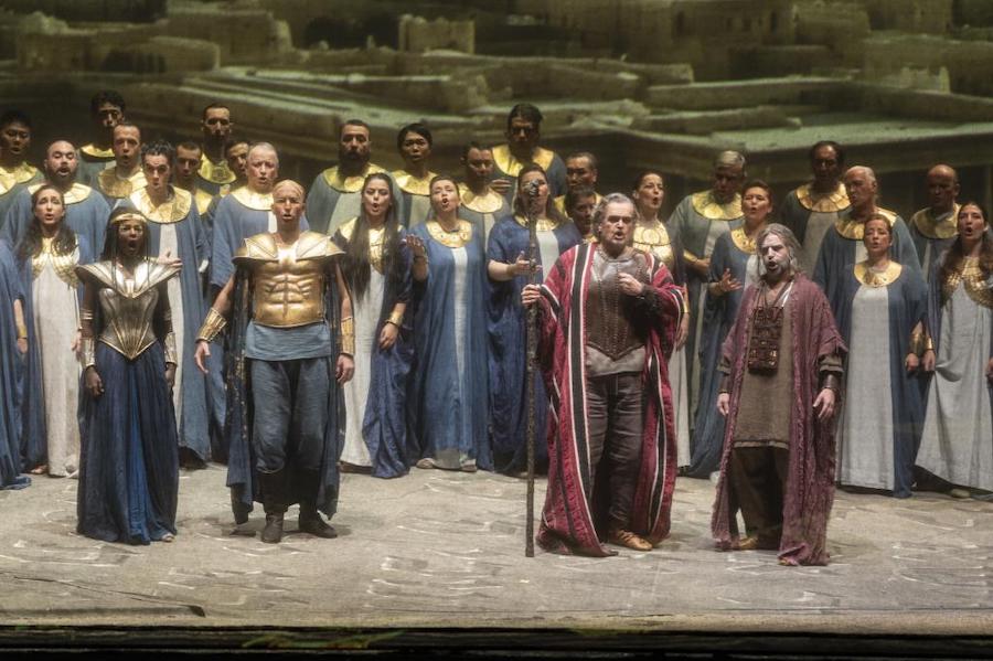 Ora a Modena, al Teatro Comunale Pavarotti-Freni e coprodotto con i teatri di Piacenza e Reggio Emilia, viene messa in scena la versione napoletana del 1819. Il regista Pier Francesco Maestrini costruisce uno spettacolo in linea con il suo stile, minimalista nei mezzi e con una sua grandiosità nei risultati, grazie a un doppio schermo, un velatino al proscenio e uno sul fondo, su cui vengono proiettate le immagini video di Nicolás Boni con effetto 3D. Ecco allora il cielo plumbeo solcato da fulmini, la pioggia di fuoco, il mare che si divide, ma anche gli interni della reggia del faraone o la grotta del secondo atto. Essenziali le scenografie realizzate dal Laboratorio di scenografia del Teatro Comunale di Modena che si adattano alla scelta iconografica del regista. I costumi di Stefania Scaraggi rimandano all’epoca biblica e distinguono i due popoli antagonisti, con ampio uso dell’oro per gli egizi. Grazie alle luci di Bruno Ciulli i momenti clou della vicenda raggiungono la loro giusta dose di spettacolarità. Con la profondità affidata alla prospettiva delle immagini video, la scena si rivela appiattita e i movimenti delle masse corali piuttosto limitati, il che sottolinea la formula oratoriale che era nelle intenzioni dell’autore. Anche la gesticolazione è lasciata alla buona volontà degli interpreti, quasi esagitata quella di Osiride, totalmente statica quella di Amaltea.