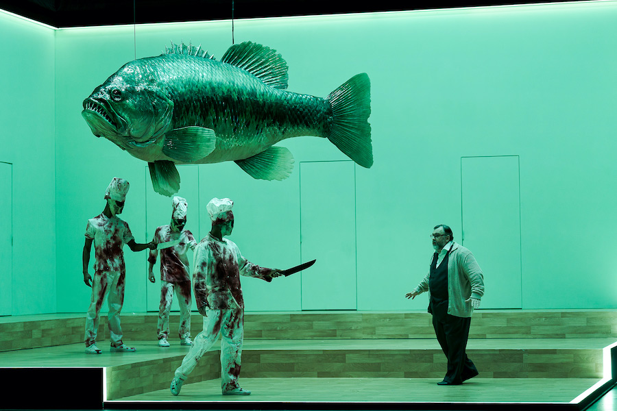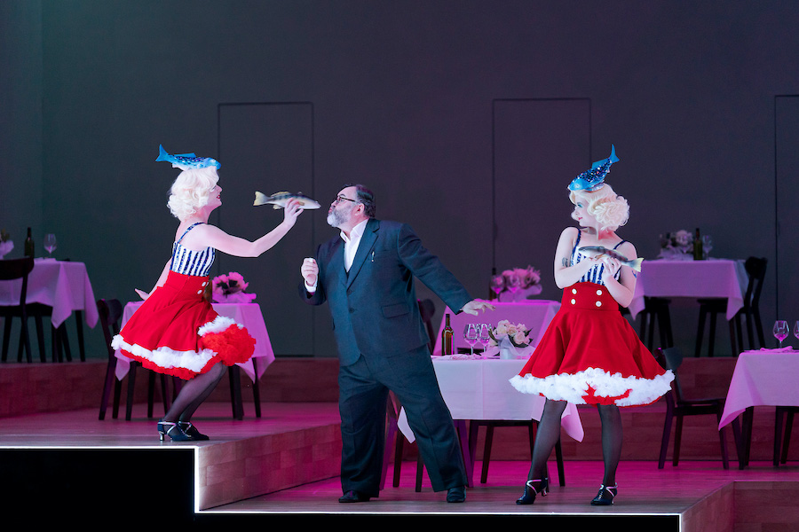 Bene i due innamorati Eurimaco e Melanto, affidati ad Alberto Allegrezza e al soprano bulgaro Alena Dantcheva, mentre l’affascinante Chiara Brunello qui diventa con grande bravura la vecchia Ericlea. Completano i personaggi umani il convincente Eumete di Francisco Fernández-Rueda, Pisandro (Arnaud Gluck, controtenore dalla voce non molto sonora), Anfinomo (il tenore Roberto Rilievi) e Antinoo (l’ottimo basso Matteo Bellotto), i tre Proci che Livermore fa diventare guappi arroganti. Tra le dèe abbiamo le lussuose presenze di Giulia Bolcato (Amore e Giunone), Cristina Fanelli (Fortuna) e soprattutto la Minerva trasformista di Arianna Vendittelli a cui Monteverdi affida la parte vocalmente più impegnativa. Gli dèi maschili hanno la voce eccezionalmente ampia e variegata di Luigi De Donato, sarcastico Tempo ed elegantissimo Nettuno, e di Valentino Buzza, come al solito vocalmente manierato ma qui più accettabile trattandosi del nume dei numi, Giove. Ancora due gli interpreti da citare: nel prologo Monteverdi e Badoaro ci mostrano la Humana Fragilità che il regista vede nella nudità violata di una donna, qui la brava Chiara Osella, mentre come sodale e parassita dei Proci introduce il personaggio dell’ingordo e materiale Iro che Livermore ha tenuto per sé. Ricordandosi infatti del suo passato di tenore e del suo debutto proprio qui a Cremona nel 1992, dopo 33 anni ritorna come regista e come cantante caricando il suo grottesco personaggio di tutta l’intelligenza teatrale accumulata in questi anni e vantando una solida prestanza vocale. Una partecipazione la sua con cui ha voluto dimostrare riconoscenza ai suoi maestri di allora, in primis a Carlo Maier che presiedeva la giuria del concorso per vocalità monteverdiana, e un tributo all’amata figura del Divino Claudio. (1)