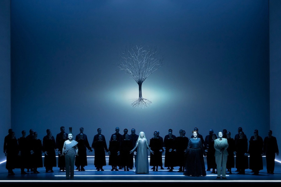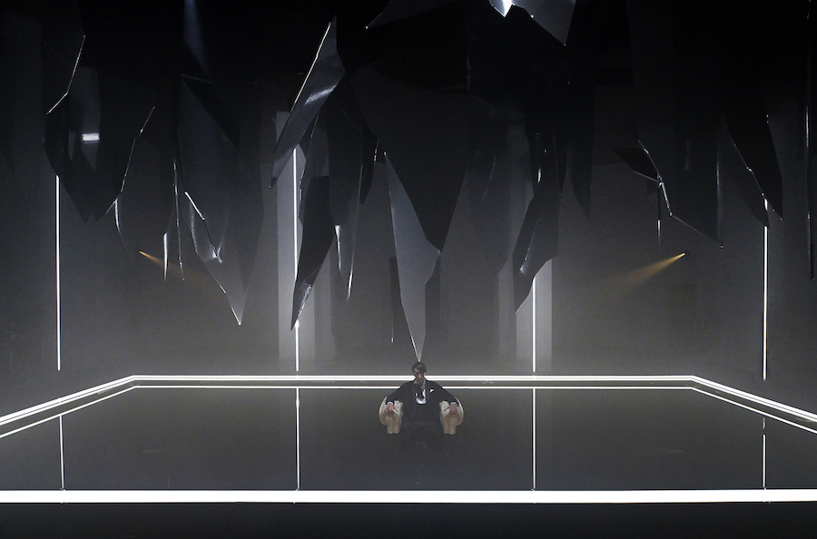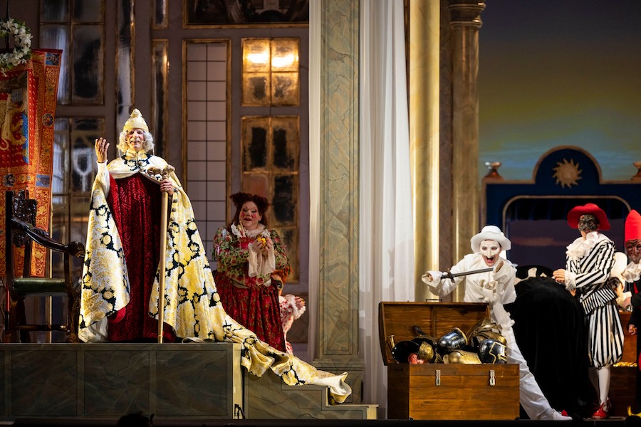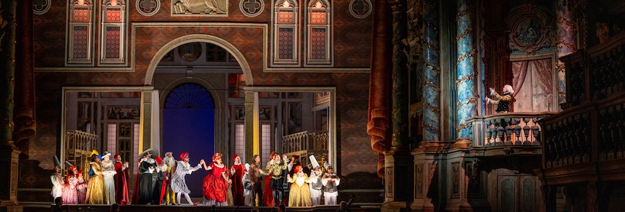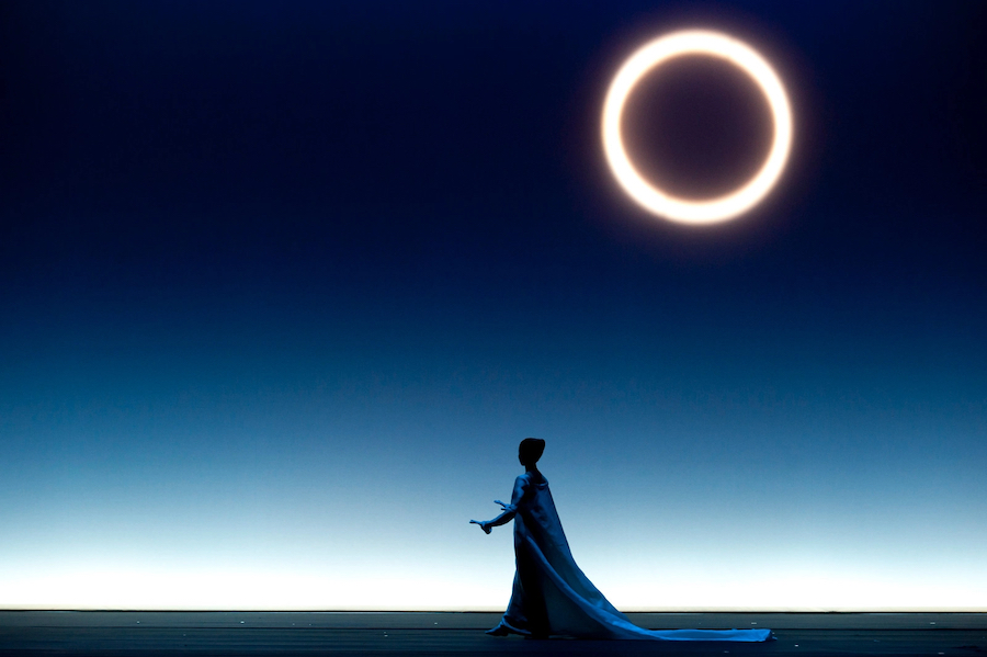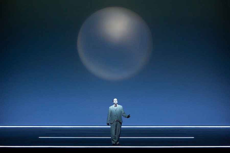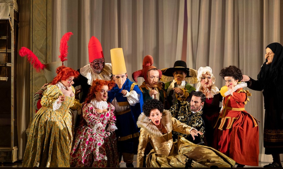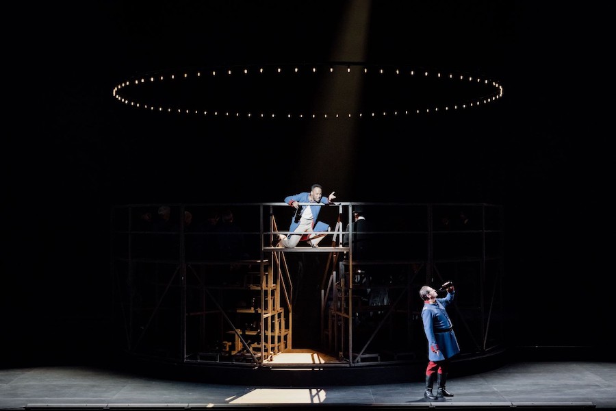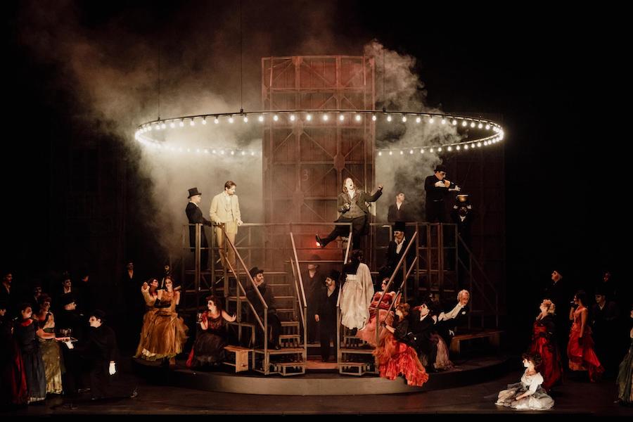 La regia di Denis Podalydès è sobria, intelligente, essenziale, niente colossi scenografici. Éric Ruf costruisce una piattaforma girevole, nuda, con pochi elementi maneggiati da due servitori in bombetta, usciti da una cave di esistenzialisti della Parigi 1950 o da un quadro di Magritte. Una corona di lampadine cala o si inclina, un simbolismo minimo, ma efficace. I costumi di Christian Lacroix – l’haute couture che flirta con il Secondo Impero – riportano l’azione all’epoca della composizione, senza leziosità da cartolina e con efficacia: nella notte di Walpurga le streghe si liberano dei loro cenci neri dando vita a un’orgia di colori nel palazzo delle regine del passato.