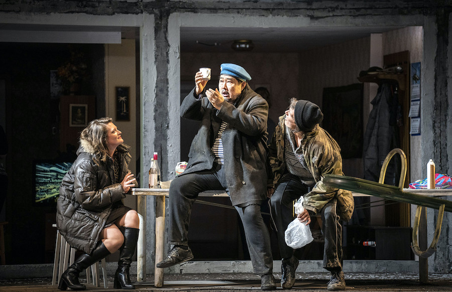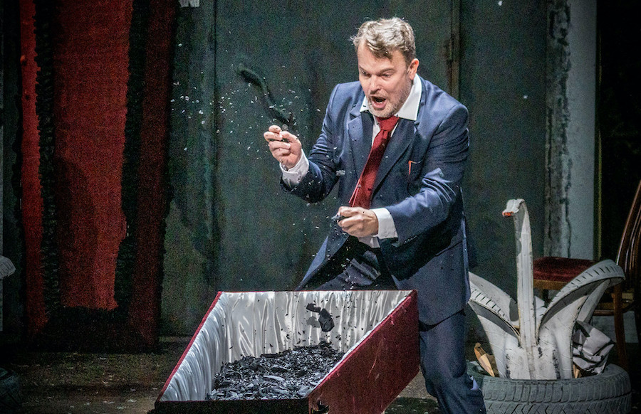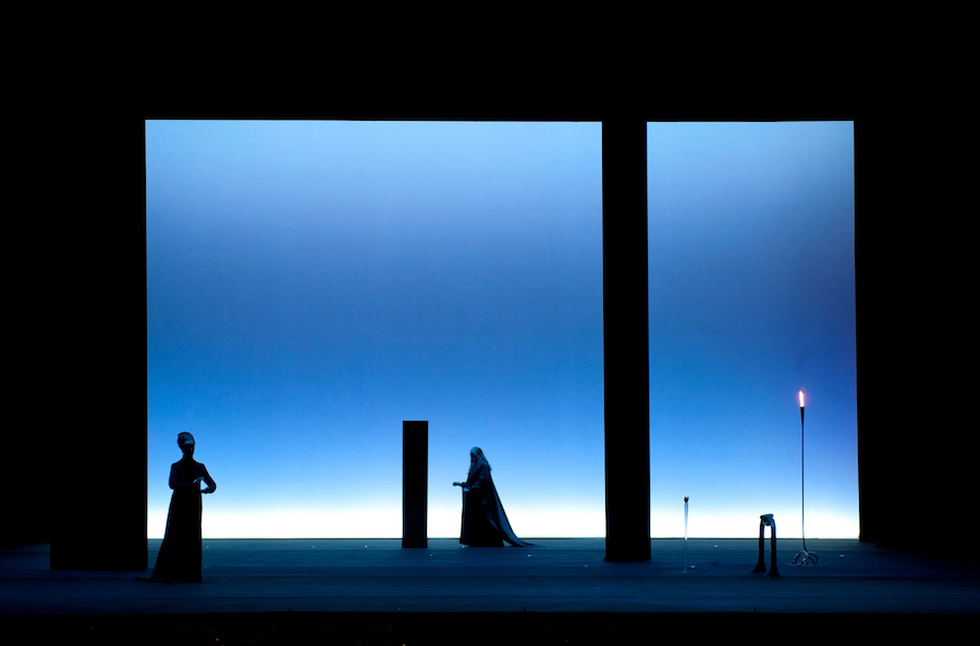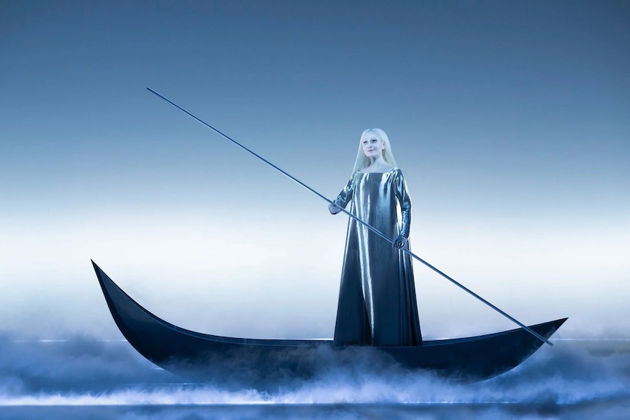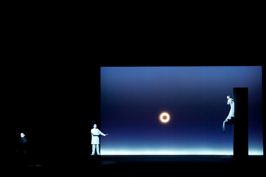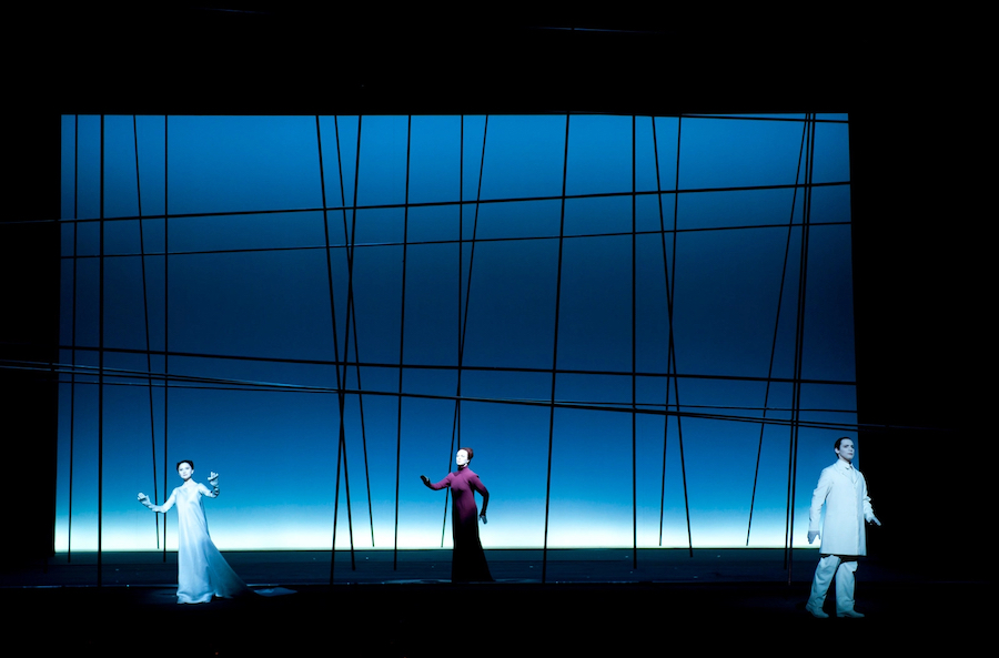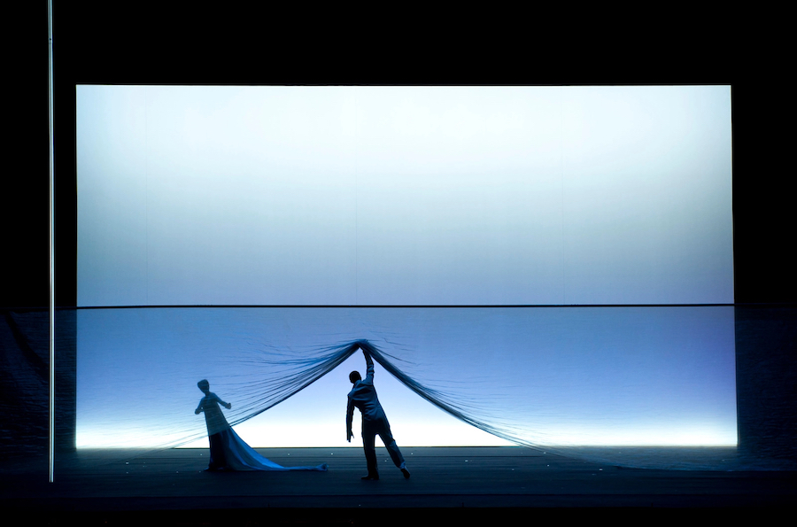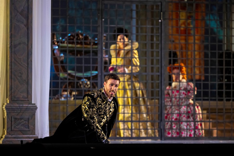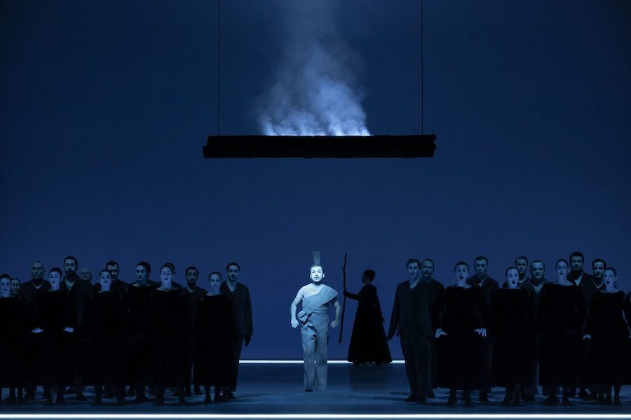 La regia di Denis Podalydès è sobria, intelligente, essenziale, niente colossi scenografici. Éric Ruf costruisce una piattaforma girevole, nuda, con pochi elementi maneggiati da due servitori in bombetta, usciti da una cave di esistenzialisti della Parigi 1950 o da un quadro di Magritte. Una corona di lampadine cala o si inclina, un simbolismo minimo, ma efficace. I costumi di Christian Lacroix – l’haute couture che flirta con il Secondo Impero – riportano l’azione all’epoca della composizione, senza leziosità da cartolina e con efficacia: nella notte di Walpurga le streghe si liberano dei loro cenci neri dando vita a un’orgia di colori nel palazzo delle regine del passato.