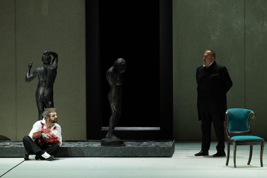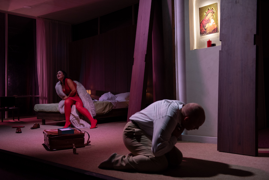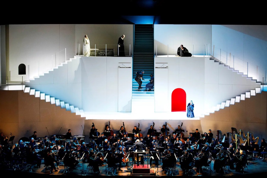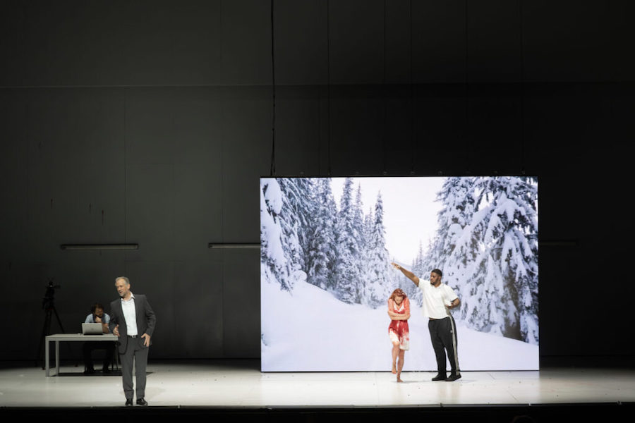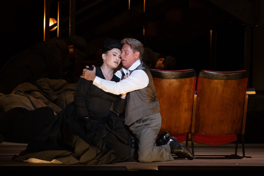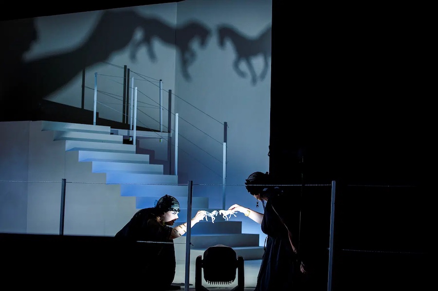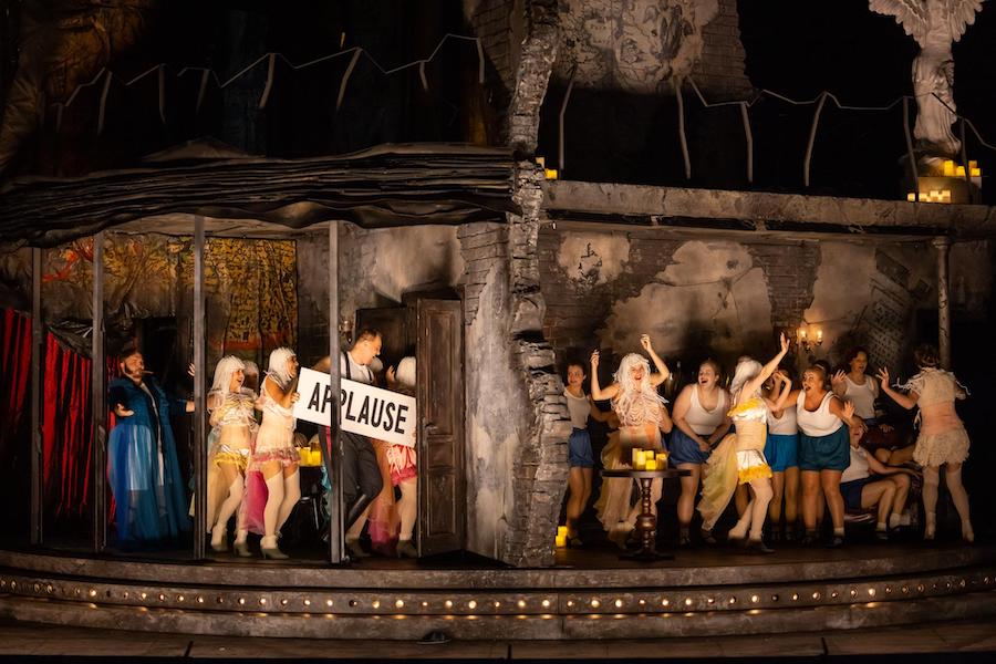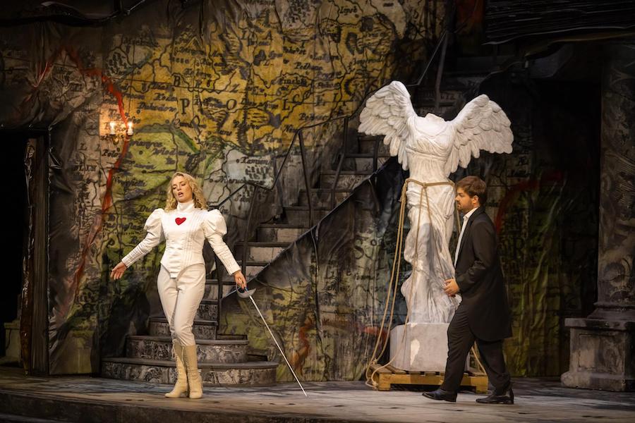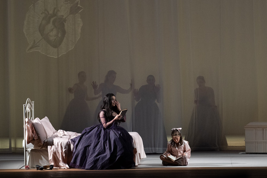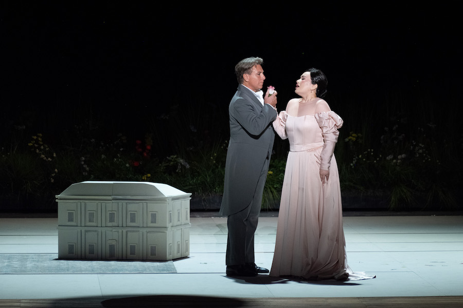 La parte visiva è curata con gusto cinematografico: il disegno luci di Giuseppe di Iorio e le proiezioni di Karolina Fender Noińska accompagnano l’evoluzione della scena con precisione poetica. L’insieme è armonioso, di grande eleganza formale, capace di alternare leggerezza ironica e riflessione malinconica senza mai cadere nell’enfasi. Qualche pausa forse rallenta il flusso narrativo, ma l’equilibrio fra tradizione e innovazione resta saldo fino al finale, dove la figura della Contessa, ormai sola, si dissolve come un’eco del passato. Sofulak elimina completamente i dialoghi parlati, lasciando che sia la sola musica a guidare la narrazione. Una scelta decisamente discutibile che manda all’aria l’equilibrio previsto tra musica e recitazione così come la drammaturgia. (1)