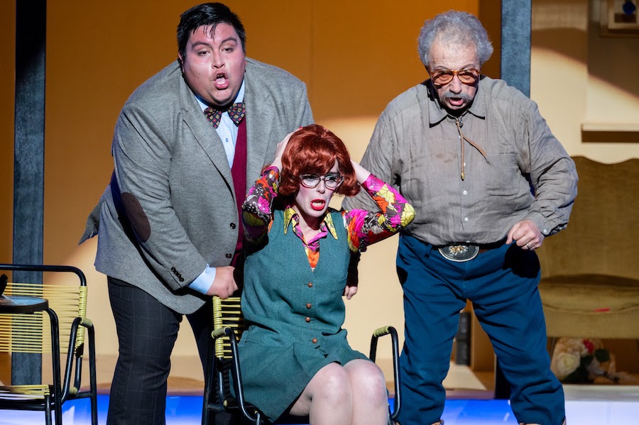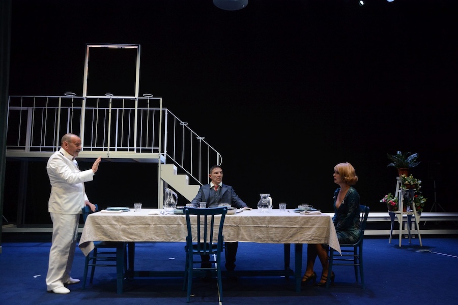 La messa in scena di Stefania Bonfadelli unisce, non solo scenograficamente, i due atti unici: le situazioni sono in qualche modo speculari, i personaggi dell’una li ritroviamo nell’altra. La comicità non è ottenuta con la facile caricatura dei personaggi, ma con il preciso incastro delle situazioni nel parallelismo dei due matrimoni. La funzionale e visivamente pregevole scenografia di Serena Rocco affianca la farmacia di Annibale Pistacchio (Il campanello) alla locanda a tre stelle di Séraphine (Deux hommes et une femme). I coloratissimi costumi anni ’60 di Valeria Donata Bettella e le luci di Fiammetta Baldiserri ricreano un mondo gustosamente caratterizzato da pellicola del boom italiano in cui si calano con divertita partecipazione i personaggi e i coristi. Tutti sfoggiano una recitazione spontanea e fluida con divertenti gag e controscene.