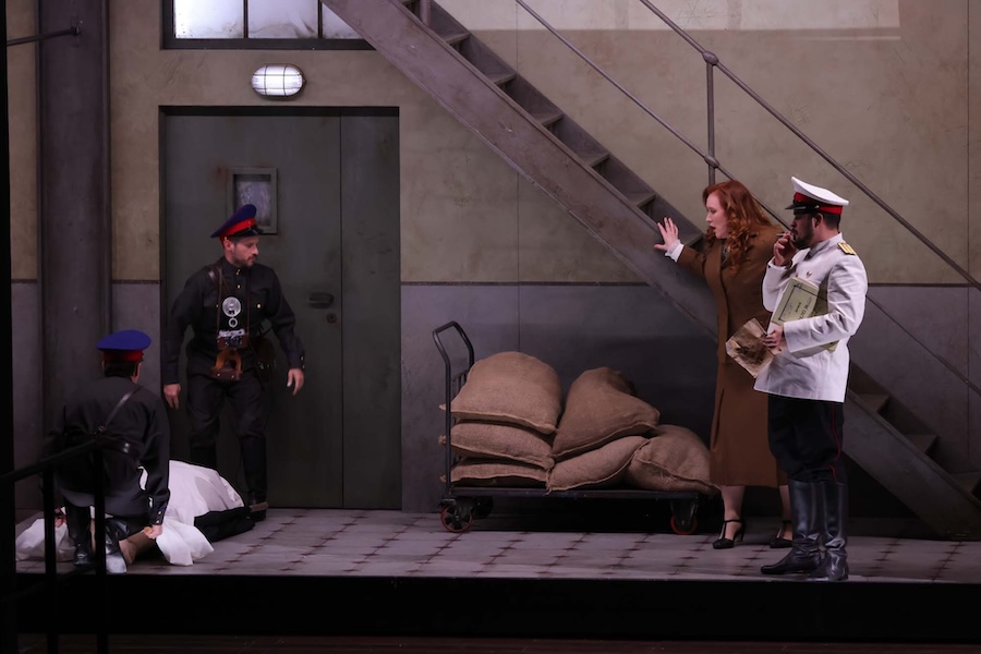 Accanto a lei, Alexander Roslavets dà a Boris Izmajlov — il suocero bigotto e lussurioso — un misto di brutalità e rotondità vocale; Najmiddin Maylyanov (Sergej) convince meno per proiezione, ma compensa con presenza fisica; Evgenij Akimov è l’inetto marito Zinovij, mentre Ekaterina Sannikova è una dolente Aksin’ja, vittima della violenza maschile. Elena Maximova (Sonetka) brilla per sensualità velenosa, e Oleg Budaratskij delinea un capo della polizia annoiato e grottesco. Spiccano le figure di contorno: Valerij Gilmanov, pope caricaturale e alcolico, che benedice il cadavere di Boris con un sermone da cabaret grottesco; Alexander Kravets, contadino ubriaco che canta all’ebrezza della vodka; e Goderedzi Janelidze, il vecchio forzato dell’ultimo atto, che intona con tono dolente la condizione senza scampo dei deportati. Eccellente come sempre il Coro del Teatro alla Scala, istruito da Alberto Malazzi, capace di precisione, forza e intensità teatrale e a suo agio nella lingua russa.