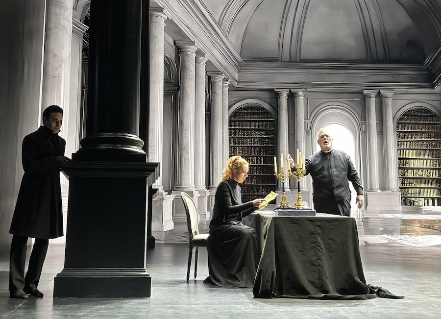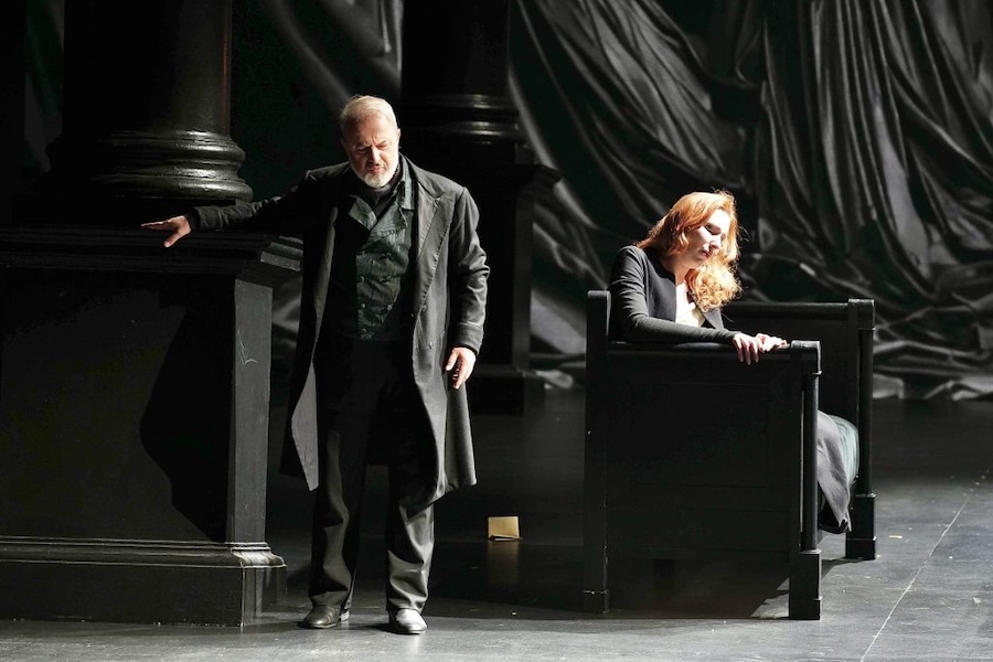 L’ambientazione, dominata dai neri severi della morale protestante, concentra l’azione nella sua dimensione borghese e domestica, quasi anticipando atmosfere che saranno proprie del teatro ibseniano. La drammaturgia procede per accenni, per gesti misurati, per silenzi carichi di senso: un teatro che evita l’enfasi e punta invece alla densità etica ed emotiva. In questo contesto si inseriscono efficacemente i video di Matteo Letizi, che amplificano le profondità sceniche e dialogano con architetture di gusto neoclassico, e il lavoro sulle luci di Massimo Gasparon – anche regista collaboratore – caratterizzato da forti contrasti chiaroscurali e da tagli luminosi di ascendenza caravaggesca. Ne deriva un’impressione complessiva di asciuttezza e concentrazione, nella quale ogni elemento scenico assume una funzione semantica precisa.