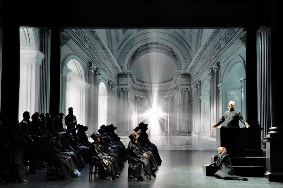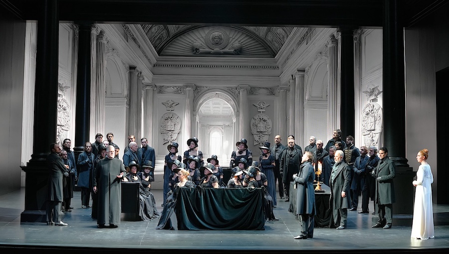 Dopo il celebre allestimento di Graham Vick al Teatro Farnese di Parma nel 2017 – che coinvolgeva il pubblico in un’esperienza immersiva, abolendo la tradizionale separazione tra scena e platea – Pier Luigi Pizzi torna a confrontarsi con il titolo secondo una poetica che gli è propria: firmando regia, scene e costumi, Pizzi costruisce uno spettacolo di rigorosa eleganza formale, fondato sulla sottrazione e sulla coerenza interna. Nessun ammiccamento a modernizzazioni estrinseche o a soluzioni illustrative: al contrario, la regia si pone come atto di ascolto della partitura e del libretto, valorizzandone le implicazioni già inscritte nel testo. È una concezione di “modernità” che rifiuta l’aggiornamento superficiale per affidarsi alla precisione del segno e alla chiarezza drammatica.