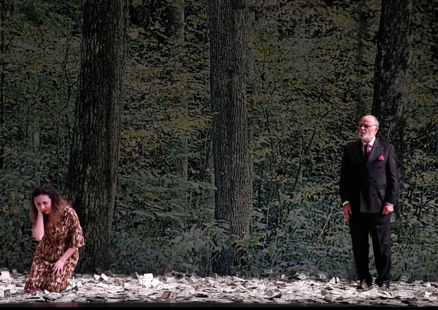 La dimensione pubblica della vicenda è uno dei cardini della regia. Le scene di festa, lungi dall’essere parentesi decorative, si configurano come rituali sociali rigidamente regolati. I movimenti del coro e dei comprimari appaiono calibrati, quasi coreografici, a suggerire un mondo governato da codici invisibili ma ferrei. In più momenti, i personaggi si dispongono frontalmente verso la platea, creando un sottile cortocircuito percettivo: il pubblico non assiste soltanto, ma si ritrova implicitamente coinvolto, specchiato nella collettività che osserva e valuta Violetta. Elemento onnipresente è il denaro: banconote coprono pavimenti e piovono dall’alto come foglie, vengono strappate con avidità dalle mani di Annina dal medico “pietoso”, mentre Annina stessa scappa con la pelliccia della signora appena questa esala l’ultimo respiro.