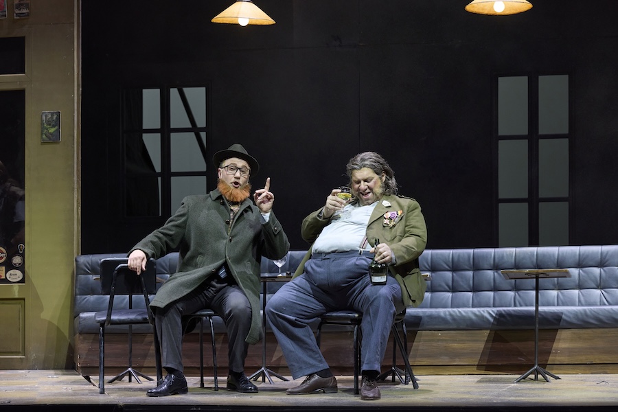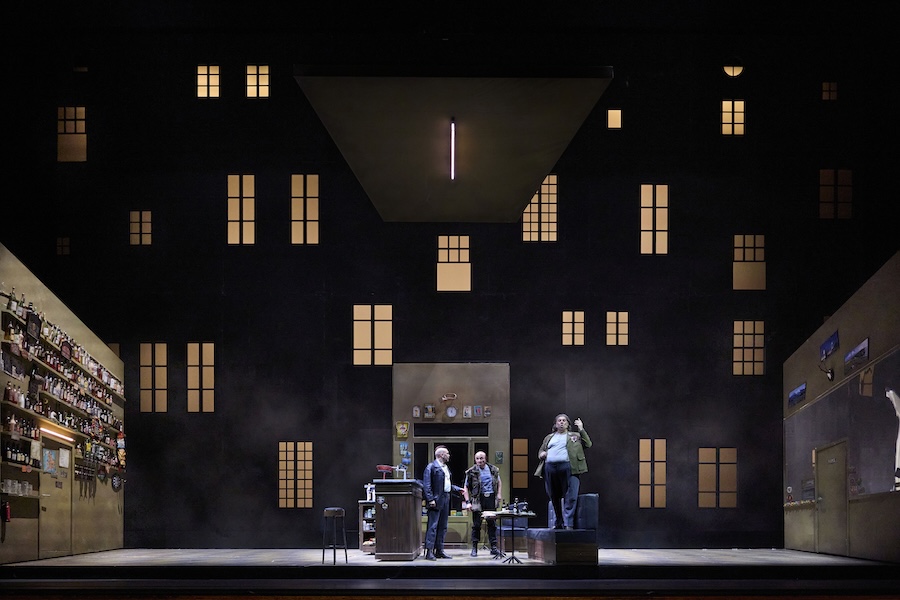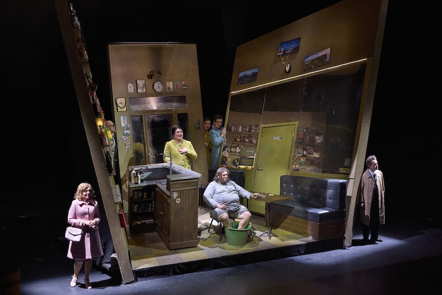 Lo spettacolo di Laurent Pelly, ripreso da Benoît De Leersnyder, con scene di Barbara de Limburg e luci di Joël Adam, affronta il consueto dilemma: come mettere in scena un’opera gravata da una tradizione tanto solida quanto ingombrante. Se Carsen la ambientava negli anni ’50 e Michieletto nella Casa di riposo Verdi di oggi, Pelly sceglie una via intermedia: anni ’60-’70. Falstaff conserva la pancia, l’Osteria della Giarrettiera diventa un moderno pub di provincia inglese, evocativo di atmosfere hopperiane. Il pub si presenta come un parallelepipedo compresso, quasi periclitante sotto la sovrabbondanza di bottiglie. Nell’Atto II la prospettiva si amplia, liberando lo spazio laterale e introducendo un enorme divano. Elemento drammaturgico dominante è il controllo sociale: il pub è sovrastato da un’altissima parete condominiale costellata di finestre, da cui comparse osservano e ascoltano. Lo stesso principio regge casa Ford, costruita come un incrocio di scale di gusto escheriano. Il cromatismo insiste su un verde dominante, che invade arredi e oggetti scenici.
