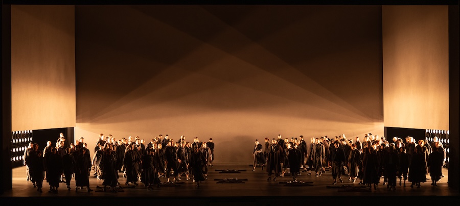 Carsen rinuncia deliberatamente alla ricostruzione storica per concentrarsi sul nucleo spirituale del dramma. Le figure collettive – monache, rivoluzionari, folla – sono disposte secondo precise geometrie, creando immagini di forte impatto simbolico. Il rapporto tra individuo e comunità, tema centrale dell’opera, si traduce così in una drammaturgia dello spazio, in cui i corpi diventano architettura.