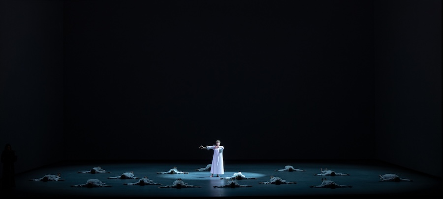 E poi c’è il finale, uno dei più sconvolgenti della storia dell’opera. Carsen evita qualsiasi realismo: niente ghigliottina in scena. La morte delle monache si consuma in una progressiva sottrazione, mentre le voci si spengono una a una sul Salve Regina. I corpi cadono, lentamente, seguendo una coreografia di Philippe Giraudeau, fino a riempire il palcoscenico di assenze. Un’immagine potentissima, che chiude lo spettacolo in un cerchio quasi perfetto, riportando lo sguardo al punto di partenza.