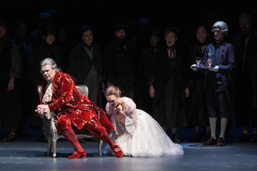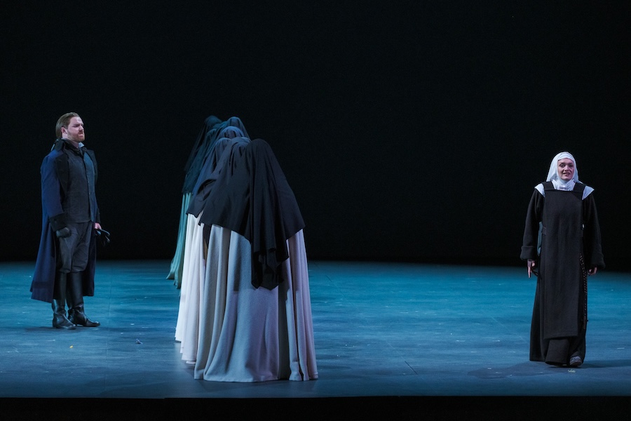 Ma non ci sono solo voci femminili in Dialogues des Carmélites, l’opera incomincia anzi con personaggi maschili prima che faccia la sua comparsa in scena Blanche. Il padre e il fratello ricordano con preoccupazione l’assalto alla carrozza da parte della folla inferocita – siamo nell’aprile 1789 e queste sono le prime avvisaglie di quello che scuoterà il paese. I cantanti sono Jean-François Lapointe e Valentin Thill: solida e autorevole la voce del baritono, limpida e chiara quella del tenore che si farà ancora ascoltare nel terzo quadro del secondo nel commovente ma teso colloquio con la sorella nel parlatorio in cui le altre monache con i loro corpi fungono da schermo divisorio.