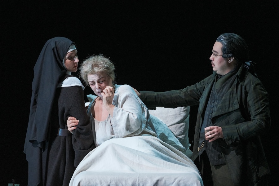 Come nella Suor Angelica pucciniana il personaggio di Genovieffa concentrava in sé l’ingenuità della giovinezza sacrificata, qui abbiamo Soeur Constance. Il suo rapporto con Blanche rappresenta uno dei pochi spiragli di tenerezza in un’opera dominata dall’angoscia. Le dà voce Francesca Pia Vitale con disarmante grazia e un affascinante strumento vocale. Meno convincente, invece, la Madame Lidoine di Sally Matthews, la cui linea vocale appare talvolta discontinua e segnata da eccessi espressivi.