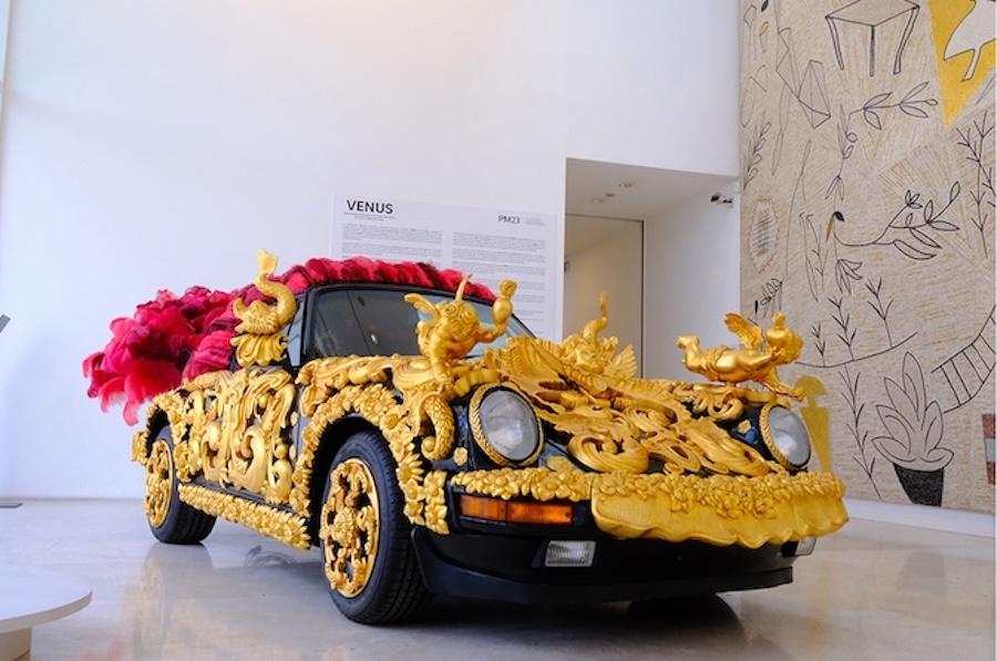 All’Ara Pacis, invece, si incontra Drag Race (2023), una Porsche 911 Targa Carrera completamente trasformata in un oggetto che sfida ogni classificazione. Il bolide si presenta rivestito da un apparato decorativo iperbarocco: volute lignee intagliate, dorature sfavillanti, imbottiture rosso fuoco. L’automobile perde la sua funzione originaria per diventare una sorta di carro festivo, un trionfo carnevalesco che mescola cultura popolare, ironia e senso teatrale. È un oggetto che celebra la metamorfosi e suggerisce come ogni identità possa essere travestita, amplificata, reinventata.