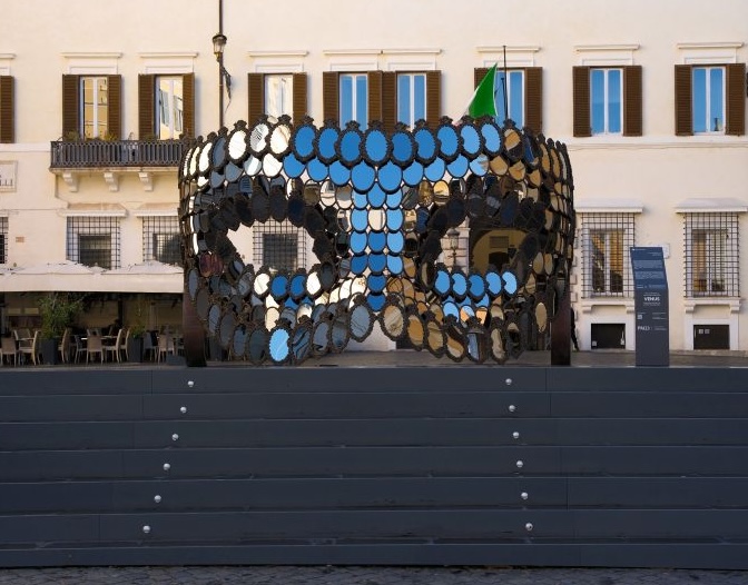 In questo progetto espositivo, anche la città di Roma gioca un ruolo fondamentale, diventando essa stessa parte integrante dell’esperienza. Tre installazioni monumentali sono state collocate in punti strategici, trasformando il paesaggio urbano in una scenografia viva. Sulla terrazza del Pincio si erge Solitaire #3 (2024), opera che amplifica il senso della promessa d’amore fino a renderla un fatto quasi cosmico. Una piramide rovesciata composta da bicchieri da whisky — tumbler tipici dei club maschili — irradia luce sopra un anello costruito con cerchioni in lega, simbolo potente di una virilità competitiva e automobilistica. L’effetto complessivo è quello di una riflessione sulla monumentalità dei sentimenti e sulla loro rappresentazione.