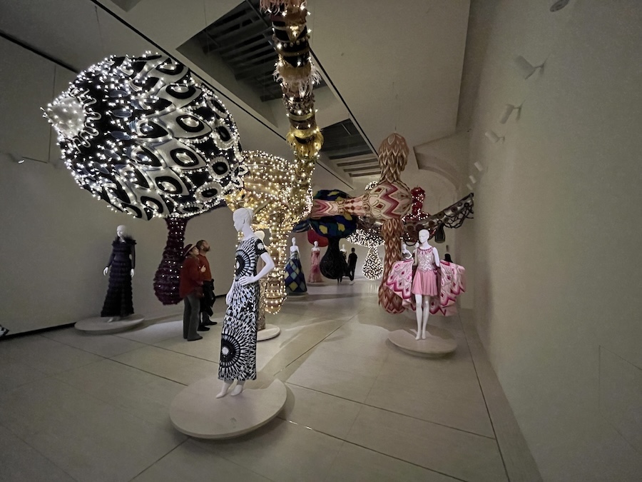 All’interno del palazzo il percorso espositivo colpisce immediatamente per la sua forza scenografica. Gli abiti iconici di Valentino — emblemi di perfezione sartoriale — sono inseriti in ambienti costruiti dalle installazioni di Vasconcelos. Tessuti preziosi, ricami elaborati e silhouette impeccabili dialogano con strutture monumentali, materiali inaspettati e giochi di luce che trasformano ogni sala in uno spazio sospeso tra realtà e sogno.