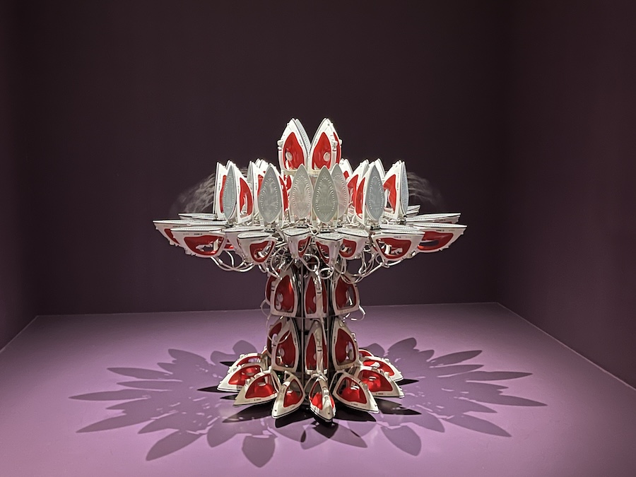 A questo immaginario si affianca quello domestico, rappresentato da Full Steam Ahead (Red) #1 (2012), una scultura cinetica composta da ferri da stiro che emettono vapore, trasformandosi in un totem/trasformer dinamico e sorprendente. Il lavoro domestico diventa spettacolo, presenza scenica, forza visiva.