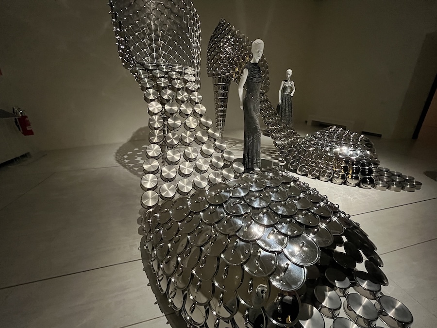 La mostra si apre con Valkyrie Venus (2025), installazioni imponenti che accolgono i visitatori con una presenza quasi dominante. Il contrasto tra la loro scala e la delicatezza degli abiti crea una tensione visiva che cattura immediatamente l’attenzione, mentre il percorso si conclude in un ambiente completamente diverso: una sala buia illuminata dalla luce tremolante di migliaia di fiori artificiali, Garden of Eden (2007–2025). Qui lo spettatore entra in uno spazio carico di simbolismo, dove il giardino — tradizionalmente luogo di origine e innocenza — diventa scenario di trasformazione e ambiguità. Le figure femminili evocate — la Fenice, la Prostituta, Cenerentola, la Femme Fatale, la Strega — convivono in un equilibrio instabile. Otto silhouette nere, slanciate e misteriose, popolano lo spazio. Le loro superfici riflettenti, decorate con paillettes e perline, catturano la luce creando giochi di trasparenza che suggeriscono e nascondono il corpo. Non sono semplici decorazioni, ma presenze vive, quasi inquietanti. Al centro, un serpente ricamato su un abito si snoda lungo la schiena, evocando il simbolo per eccellenza della conoscenza e della tentazione.