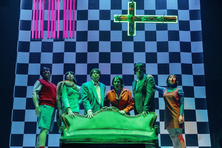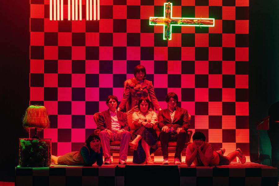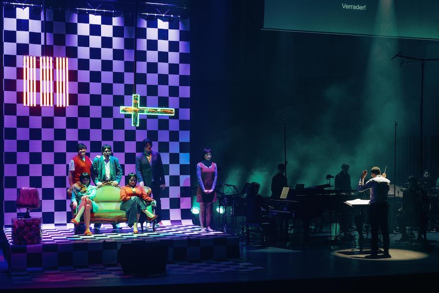 Il lavoro è ora presentato in collaborazione con il Muziektheater Transparant con l’ensemble olandese Asko|Schönberg – formato da clarinetto, tastiere, 4 percussionisti, arpa, violoncello – sotto la direzione musicale di Benjamin Haemhouts. La mise-en-espace di Aïda Gabriëls prevede che orchestra e cantanti si dividano il palcoscenico, gli strumentisti a destra, gli interpreti a sinistra in uno spazio delimitato da una superficie di piastrelle bianche e nere con in mezzo un divano attorno al quale si dispongono i personaggi. Un ironico quadro di intimità borghese è condensato in pochi elementi che caratterizzano la scelta stilistica della giovane regista belga: sul fondo un crocefisso di tubi fluorescenti e messo di traverso rivela al suo interno delle Barbie, mentre tante teste di bambole riempiono il cubo di perspex su cui poggia un abat-jour formato da una parrucca bionda.