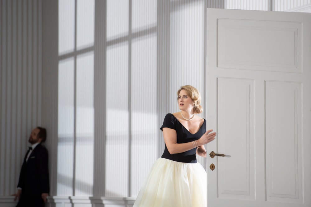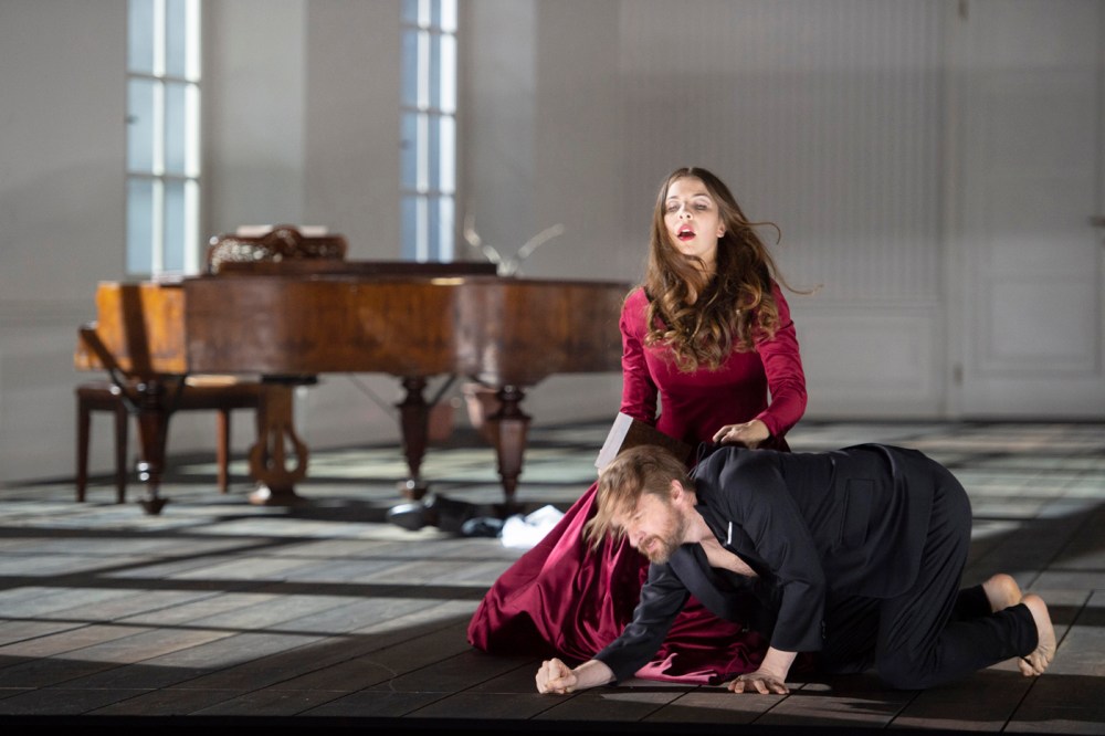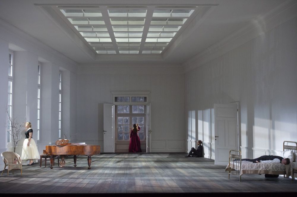 Ogni regista ha un suo caratteristico approccio e di Christof Loy sappiamo che ogni suo allestimento prende la piega di un dramma psicologico. La “große romantische Oper” del Theater an der Wien non fa eccezione con la drammaturgia di Klaus Bertisch e la scenografia di Johannes Leiacker: un’alto soffitto con lucernario, quattro grandi finestre a sinistra e un magnifico gioco, di luci di Reinhard Traub, che ricrea l’atmosfera dei diversi ambienti previsti dalla vicenda, qui ambientata in un’unica lunga stanza con un pianoforte, un letto, un alberino scheletrico in vaso. Tutto quanto sparisce nel quadro primo del terzo atto, “Notte di plenilunio. Rocce di aspetto sinistro, ricoperte da cespugli. Un ripido sentiero scende da un’altura. In primo piano una sorgente con attorno salici piangenti”. Non c’è nessuna concessione al decorativismo nella lettura di Loy, contano soltanto i sentimenti dei personaggi messi a nudo – e non solo metaforicamente: nel secondo atto Andrew Foster-Williams, l’interprete di Lysiart, mostra le sue non gloriose nudità per i dieci minuti buoni della scena prima, dal recitativo «Dove nascondermi? Dove ricuperare i miei spiriti?» all’aria che termina con «Se egli muore, il mio cuore sarà colmato, il mio cuore agitato dalla tempesta».