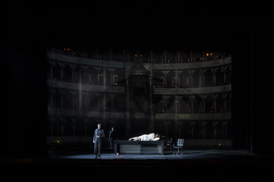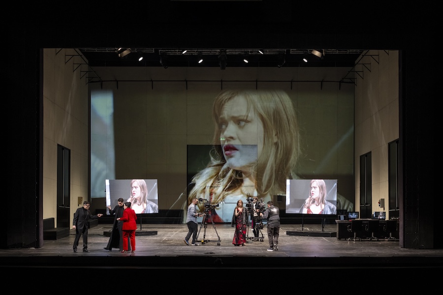 Nella scenografia di Gideon Davey, che firma anche i costumi, il palcoscenico è dominato da telecamere, schermi, luci da studio televisivo, un ambiente freddo, iper-controllato, “costruito”. Tanto il libretto è statico, quanto Carsen crea azione continua, ogni aria diventa una “performance” davanti alle telecamere e Bellezza è costantemente osservata, giudicata, esposta. Importante è la presenza di venti figuranti che si muovono secondo i disegni coreografici di Rebecca Howell. Fondamentale il gioco luci di Peter van Praet e di Carsen stesso per definire i diversi momenti introspettivi dei personaggi.