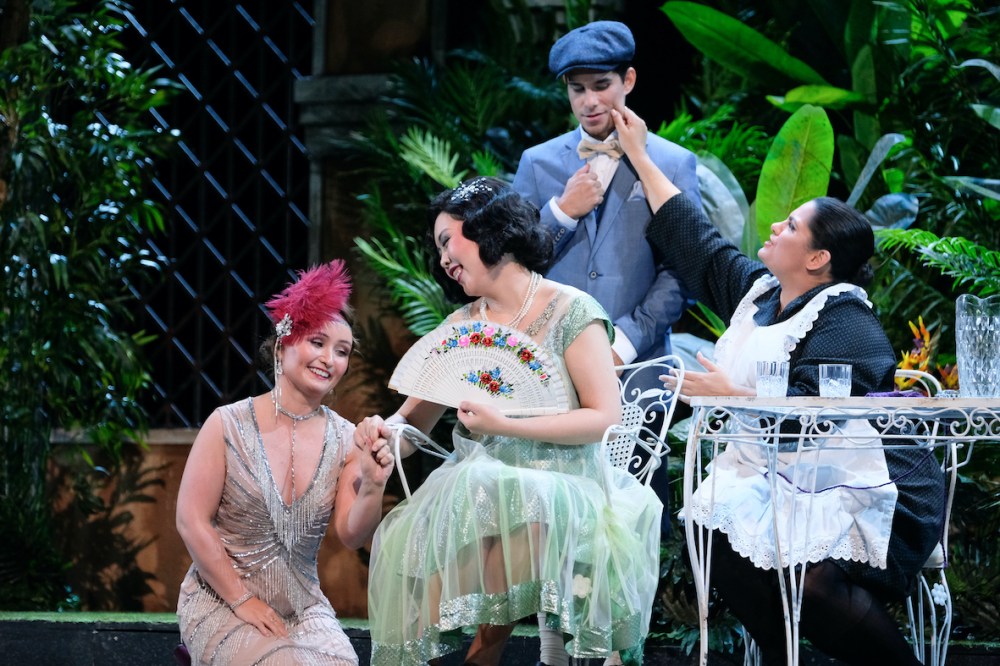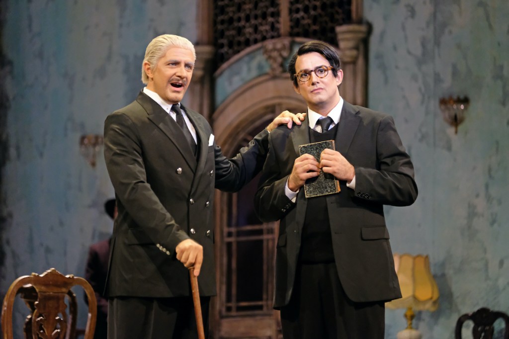 Il Trespolo tutore è un lavoro destinato a spazi molto più ridotti, ma se non altro qui quelli del Carlo Felice permettono il distanziamento in scena e in platea. Per di più i creatori dello spettacolo sono riusciti a fare di necessità virtù imbastendo una serata godibile per l’aspetto visivo con le scene di Leila Fteita e i costumi di Nicoletta Ceccolini. I registi Paolo Gavazzeni e Piero Maranghi scelgono gli anni ’30 per la loro ambientazione con una lunga e ripida scalinata incorniciata a vari livelli da lampadine luminose: Artemisia è una vamp con en tête e ventaglio di piume di struzzo, Trespolo sfoggia un lucido cilindro, Nino capelli impomatati e baffetti alla Clark Gable. L’ammiccamento al cinema muto dell’epoca avviene anche con i video in bianco e nero dei visi degli interpreti ripresi in smorfie espressive, ma non esiste una vera giustificazione per questa scelta e la drammaturgia è latente e non sfrutta certi momenti teatrali suggeriti dal testo, come gli equivoci del buio non realizzato, anzi proprio le luci qui sembrano fare difetto per imprecisione.