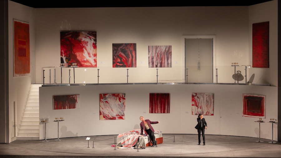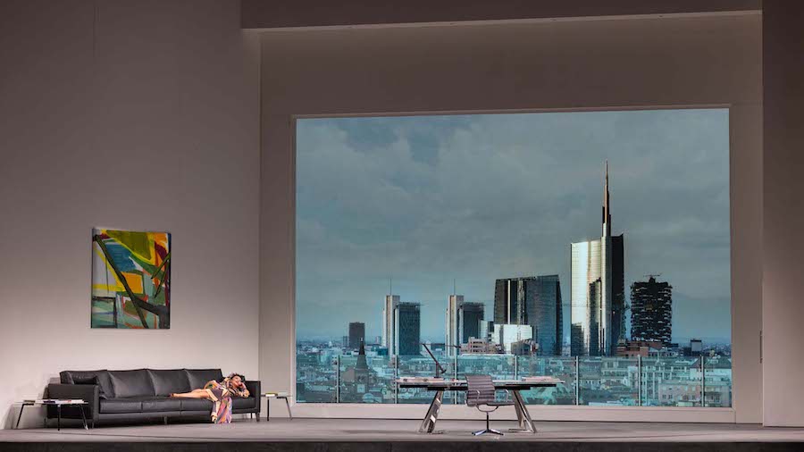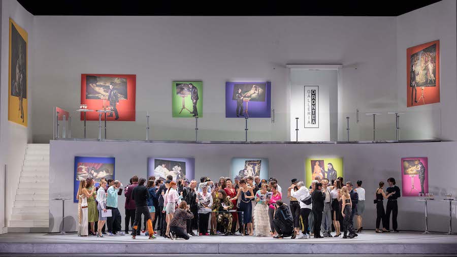 Pelly risolve con grande eleganza la debole drammaturgia puntando a una regia di precisione cronometria e un raffinatissimo gioco visivo che richiama il bianco e nero di certi spettacoli di Ponnelle, sia nei costumi da Pelly stesso ideati sia nelle scenografie di Massimo Troncanetti illuminate dalle luci di Marco Giusti che danno sfumature pastello al grigio degli abiti. La scena è quasi nuda nei primi due atti, con porte sullo sfondo e sui lati e otto servi di scena che si muovono secondo un meccanismo di assoluta precisione per portare, o togliere, i pochi oggetti necessari al momento – una sedia, un tavolo, uno strumento musicalo, una lancia… Impeccabile la gestualità che sottolinea la personalità di ogni personaggio: la supponenza di Stonatrilla, le paturnie di Smorfiosa, la svagata boria di Ritornello, lo stress di Delirio, e poi le tre madri, un tenore e due controtenori en travesti esilaranti.