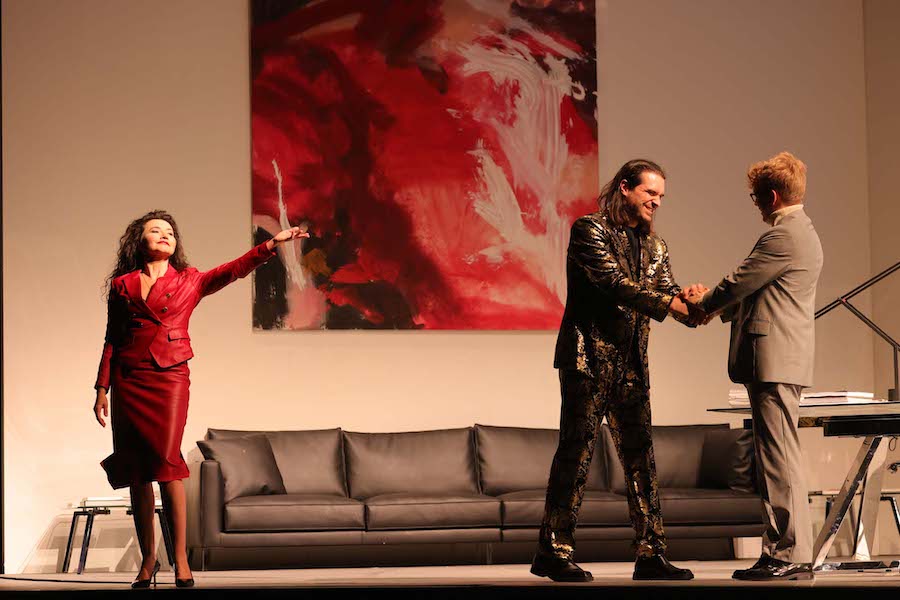 L’Opera seria di Gassmann è «un melodramma al quadrato», scrive Lorenzo Mattei sul programma di sala come sempre ricco di interessanti interventi, dove «si ride già dai nomi»: l’impresario si chiama Fallito, il poeta Delirio, il musicista Sospiro, il castrato Ritornello, il maestro di ballo Passagallo e i soprani Stonatrilla, Smorfiosa e Porporina fino alle rispettive madri Caverna, Befana e Bragherona. Nel primo atto c’è la presentazione dell’argomento e dei personaggi con i loro tic, le loro manie, le rivalità tra cantanti, compositore e librettista, le pretese del maestro di ballo. Nel secondo assistiamo alle prove dell’opera seria Oranzebe, dramma tragico la cui ambientazione orientaleggiante e la versificazione sono una chiara parodia del teatro metastasiano, anche se il titolo si rifà alla Aureng-Zebe, “Restoration drama” del 1675 di John Dryden. Qui il ruolo dell’impresario è devastante quando scorcia versi e ritornelli facendo indignare in egual misura poeta e musicista e indispettire i cantanti. Nel terzo vediamo finalmente la messa in scena dell’Oranzebe, presto interrotta però dalle intemperanze del pubblico e dalla fuga con la cassa dell’impresario.