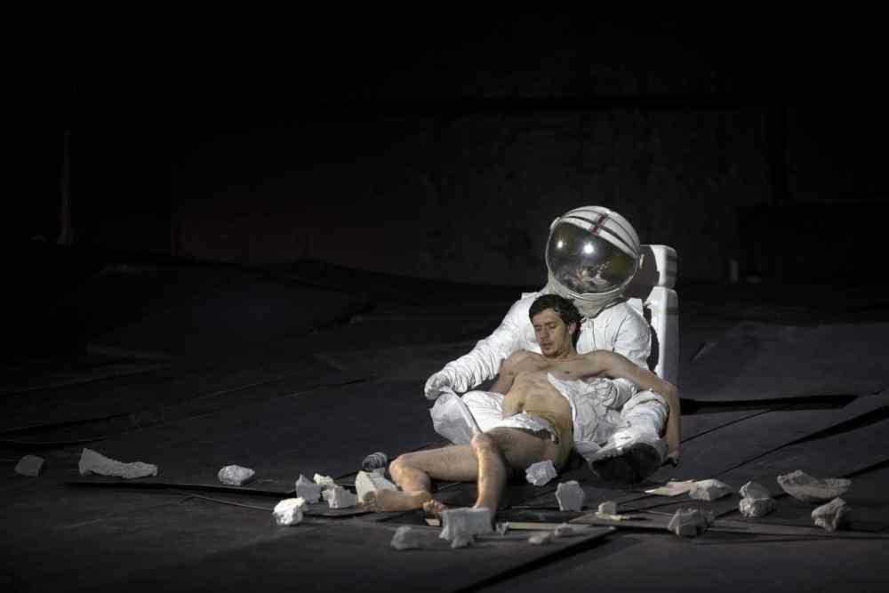 In scena due uomini: uno è Dimitris, tutto vestito di nero, l’altro è Šuka Horn, giovane, nudo, apparentemente fragile, una creatura marina che sbuca da sotto le lastre trasparenti che coprono il palcoscenico. Inizialmente è visto come una minaccia che il primo uomo cerca di contenere schiacciandolo sotto le lastre. Poi il rapporto fra i due evolve fino a diventare come quello tra un padre e un figlio, ed è quest’ultimo che alla fine sembra avere la meglio sul “vecchio” genitore. I due corpi agiscono in un mondo fantastico per luci e rumori – e qui l’acqua con i suoi suoni e le sue rifrazioni luminose gioca un ruolo quasi magico. Lo spettacolo sfiora la fantascienza, l’horror, con il buio, il bambolotto del neonato o quella piovra (spero finta!) che a un certo punto funge anche da cache sex…