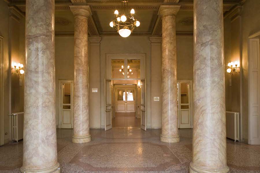 Tracce dello stabile settecentesco sono ancora visibili lungo il colonnato che delimita la parete sud del teatro, affacciata su Corso Cairoli. Il progetto di ricostruzione, realizzato dall’architetto Achille Grimaldi, fu finanziato da Ulderico Levi, esponente di una delle più importanti famiglie ebraiche della città. Secondo la moda di fine XIX secolo e su richiesta della cittadinanza, l’Ariosto fu progettato come spazio teatrale a destinazione plurima, adatto sia alle rappresentazioni di prosa sia alle esibizioni delle compagnie equestri. L’impianto architettonico seguì il modello dei politeama inglesi e francesi: la cavea prese forma semicircolare e la struttura a palchi, mantenuta per il secondo ordine, fu sostituita al primo ed al terzo da gallerie uniche.