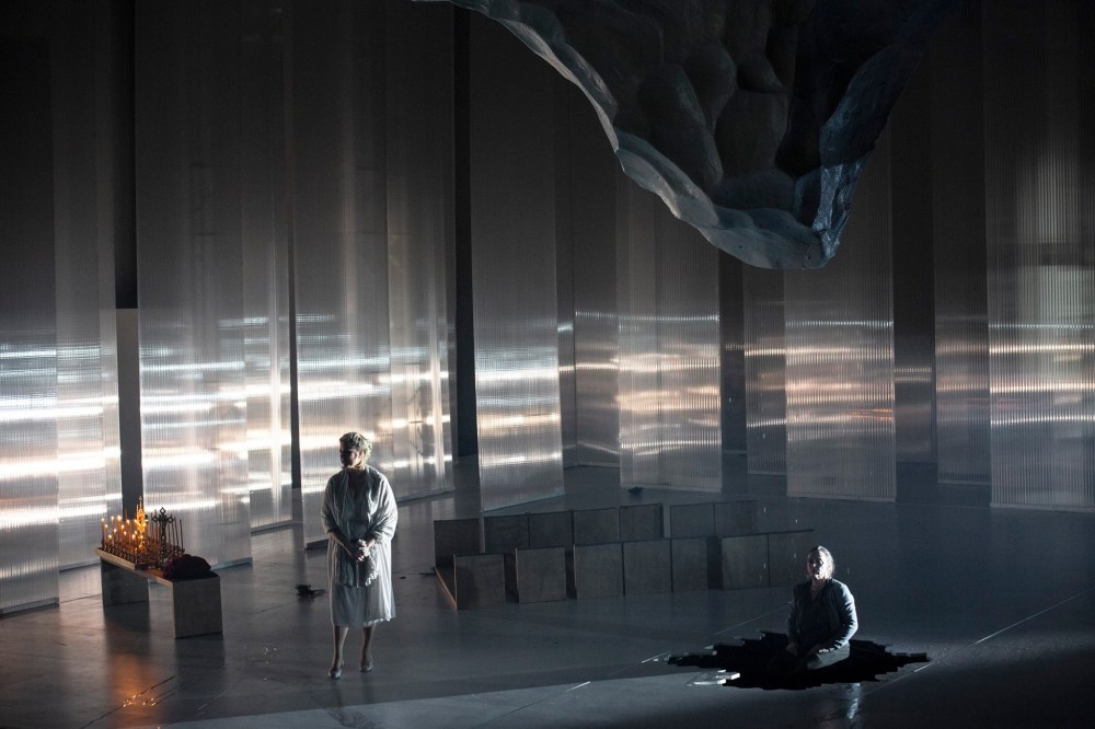 Spogliata di ogni elemento folklorico – che era stato portato volutamente all’eccesso nel primo e nel terzo atto nell’allestimento di Alvis Hermanis – la lettura di Michieletto si concentra sulle relazioni tra i personaggi (1) mentre l’ambientazione senza età è quella di una stanza dalle pareti semi-trasparenti e dall’interno chiesastico: alcune panche, un tavolino con candele e crocefissi. Al centro, nel secondo atto, la culla del neonato: per nasconderne la colpa la matrigna ha sparso la voce che Jenůfa sia partita per Vienna, mentre l’ha tenuta segregata in casa durante la gestazione e il parto. E ora prega Dio che si prenda il piccino. Visto che questo non succede e che il padre naturale rifiuta il matrimonio mentre l’altro pretendente la sposerebbe ma senza il figlio, la donna arriva alla folle decisione di far sparire nel ghiaccio il piccino.