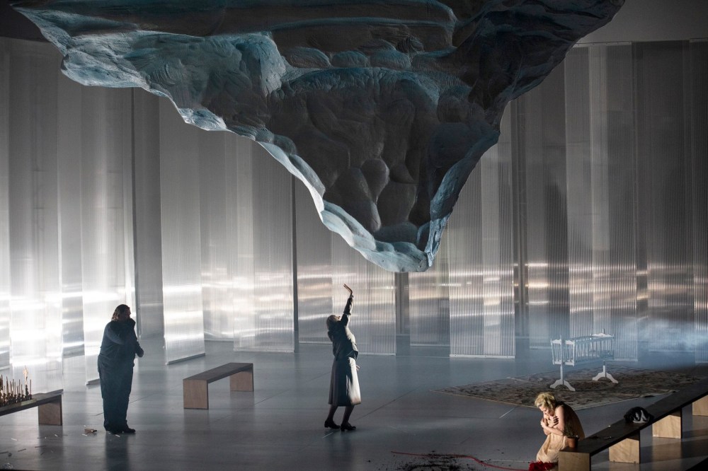 Nel frattempo vediamo che è scesa lentamente dall’alto, sempre più incombente, un’enorme stalattite di ghiaccio, la punta sommersa di un’iceberg, che ora occupa quasi tutto lo spazio della scena. La colpa si è materializzata e ora opprime i personaggi con la sua massa imponente. Ma nel terzo atto succede qualcosa, allo stesso tempo inquietante ma anche un segno di speranza: il ghiaccio incomincia a sciogliersi e gocce d’acqua scendono e spariscono nel foro del pavimento che prima era celato da un tappeto. È il disgelo, che porta alla luce il povero cadaverino del neonato figlio della colpa, ma è anche quello che vive la protagonista alla fine dell’opera quando gli ondulanti arpeggi con cui si conclude l’opera – arpeggi come quelli di un altro stupendo finale, quello del Guillaume Tell di Rossini – in questo caso ricordano i rivoli d’acqua che si liberano dalla morsa del ghiaccio. Sotto questa pioggia purificatrice la Kostelnička cerca un perdono che la società non le può dare.