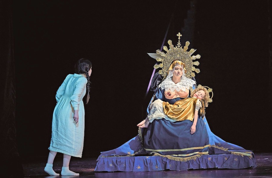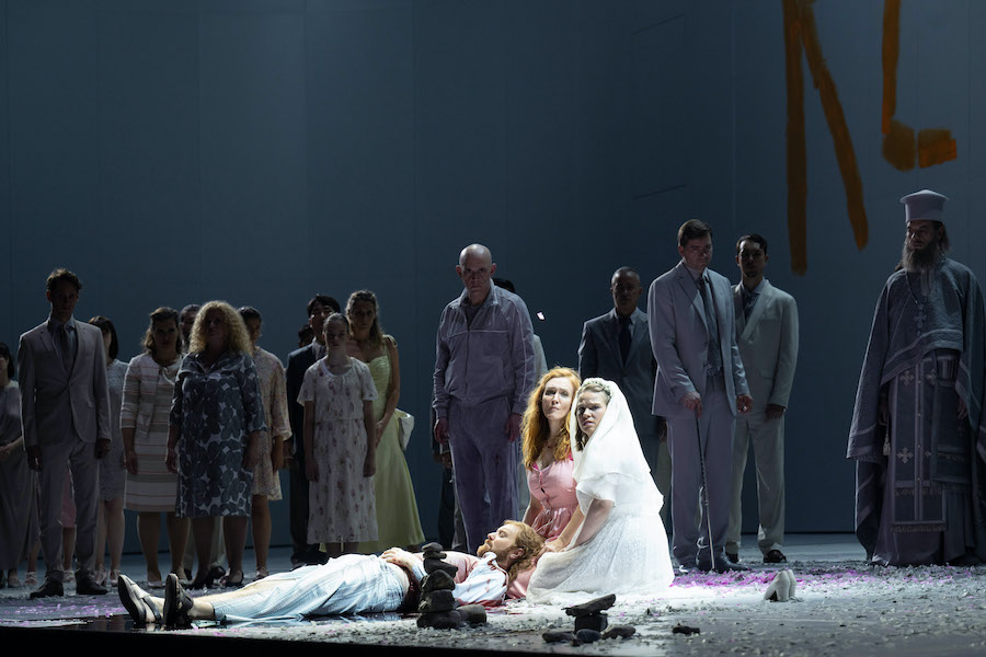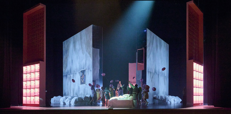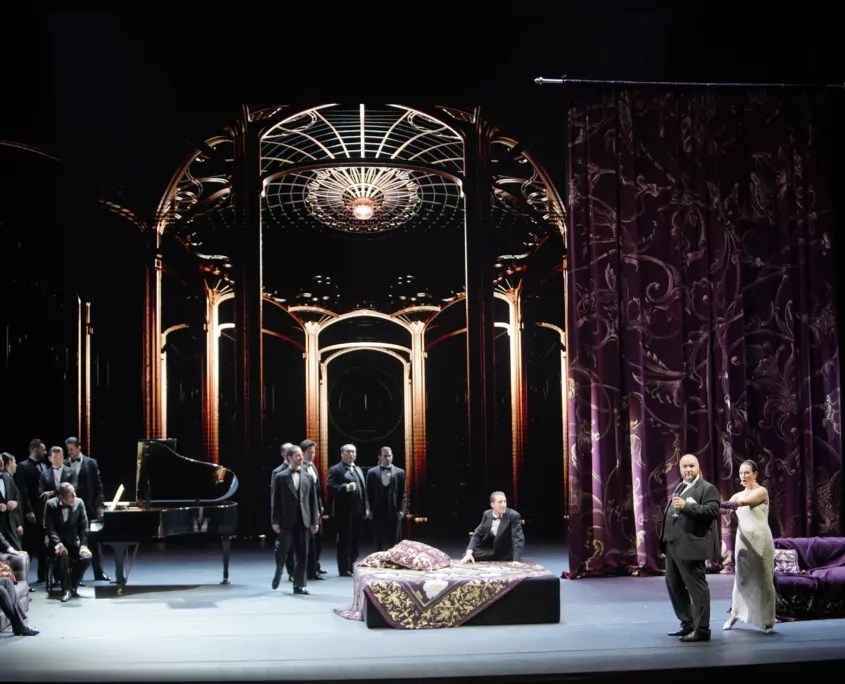 Ricca di simbolismi (l’abbazia di San Galgano è il luogo dove si svolge il finale di Nostal’gija, il film del 1983 di Andrej Tarkovskij), kolossal e divertente – come quando Altoum entra in scena tempestato di gemme in una bara di cristallo su una barca (simbolo ricorrente della morte) condotta da due guardie in kilt e maschera di Halloween – la lettura di Barkhatov prende strade bizzarre che portano lontano dalla Cina «al tempo delle favole». All’inizio del primo e secondo atto una citazione letteraria – prima il canto III dell’Inferno di Dante, poi il tema di Orfeo ed Euridice da Le metamorfosi di Ovidio – in cui domina il tema della morte, precede un video in cui vediamo gli ultimi istanti prima dell’incidente d’auto. Sospesi tra vita e morte, Calaf e Turandot alternativamente rivivono la storia raccontata dalla fiaba a modo loro. Nella dimensione fiabesca entrano spesso, e talora “a muzzo”, scendendo dall’alto, l’auto dell’incidente a portiere spalancate e la camera di rianimazione nel cui lettino si alternano lui o lei. Che la camera di ospedale richiami quella di Puccini gravemente ammalato dove si era portato la partitura di Turandot senza terminarla è una facile supposizione, così come il suicido di Liù, qui la prima fidanzata sedotta e abbandonata da Calaf, la cui coincidenza con la vecchia vicenda della giovane cameriera Doria Manfredi, probabile amante di Puccini anche lei suicida, fa venire i brividi.