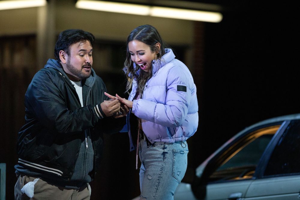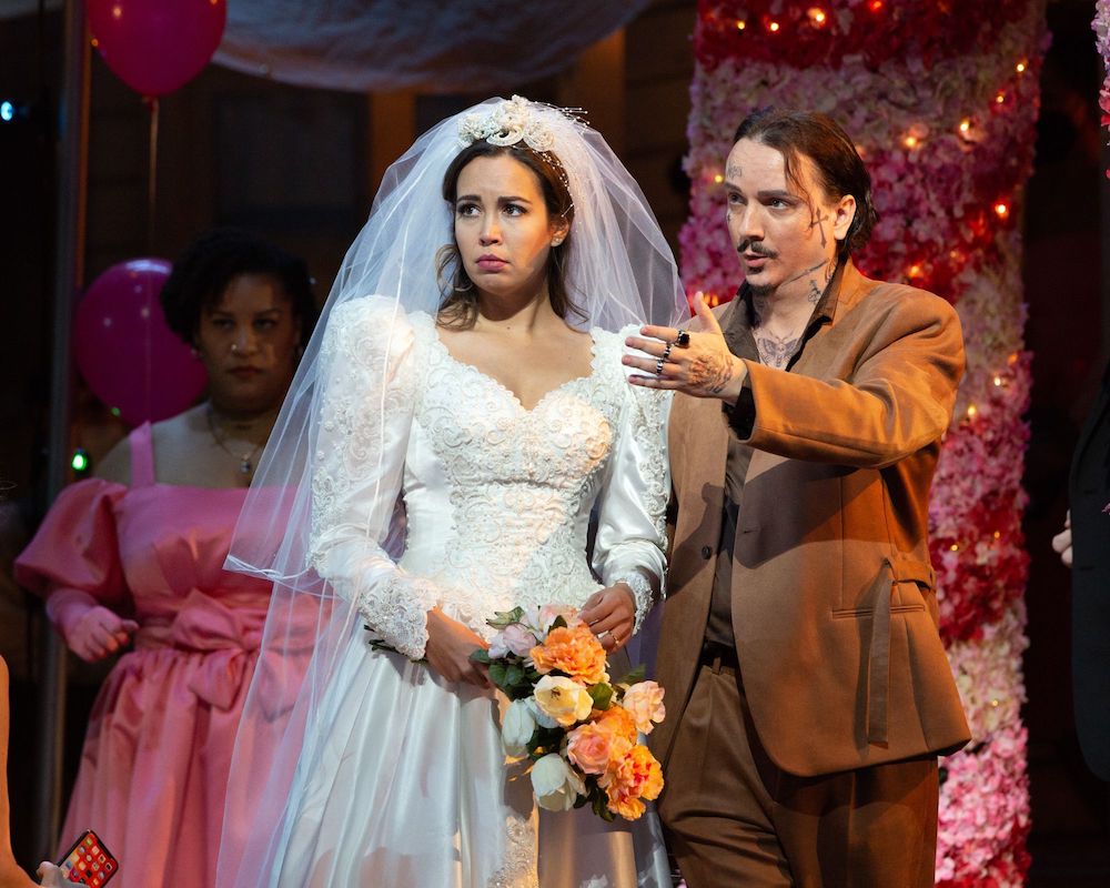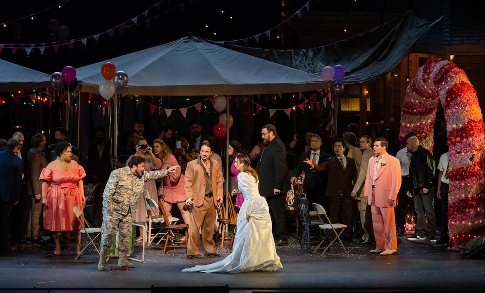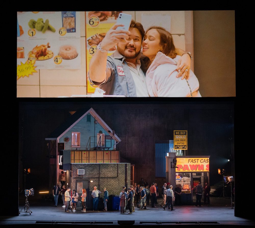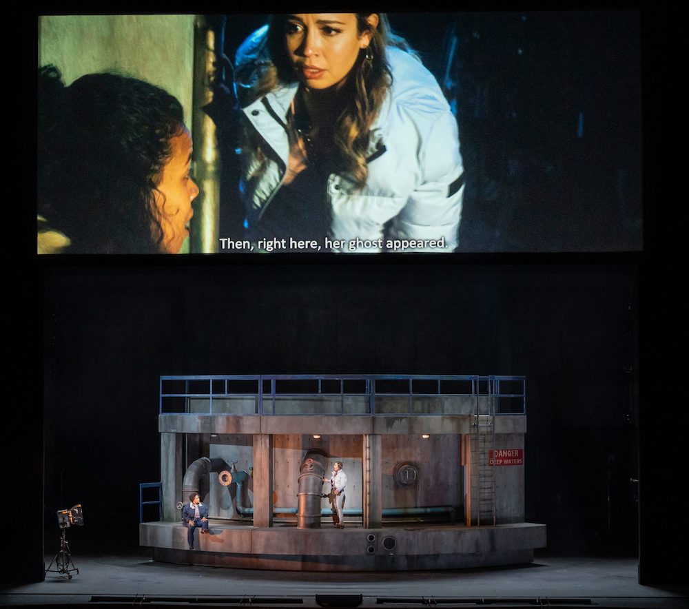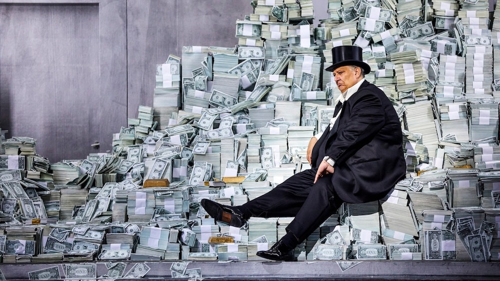 I personaggi passano da un ambiente all’altro, da quello dei capitalisti occidentali (l’Egitto di Faraone del libretto) a quello dei rifugiati (gli ebrei nell’attesa sempre delusa di partire per la Terra Promessa) nei primi due atti. Poi nel terzo la scena viene unificata e la parte sinistra diventa il palcoscenico per il balletto, un’efficace coreografia di Jeroen Verbruggen, con il pubblico degli invitati destra. Su uno schermo vengono proiettate immagini di catastrofi naturali per illustrare le piaghe mandate dal dio di Mosè agli egiziani. Nel finale, su una grande tela vediamo il Mar Rosso dividersi con gli egiziani (ossia noi occidentali con i completi scuri, le scarpe a spillo, i tailleurs…) sommersi da quelle acque vendicatrici – il rimando alle immagini dei migranti che fanno la stessa fine nel mar Mediterraneo non è certo casuale. Poi la tela si alza un’ultima volta per rivelare una spiaggia con bagnanti pigramente allungati sulle sedie a sdraio, occhiali da sole, un cocktail in mano o il telefonino. Gli ebrei sono nel frattempo scesi con i loro gilet arancioni tra gli spettatori della platea, ma sulla scena una delle bagnanti scopre sulla sabbia il bastone di Mosè che prima guarda con curiosità, poi getta con orrore, come se avesse percepito qualcosa di strano. Non c’è traccia di soprannaturale nella lettura di Kratzer: gli interventi divini sono le calamità che ci stiamo costruendo noi stessi: siccità, incendi, alluvioni, carestie, guerre sono il frutto della nostra incosciente azione sul pianeta che ci ospita. Così, anche le tenebre (prima piaga del libretto, quinta della narrazione biblica) sono causate da un black out dell’energia elettrica.