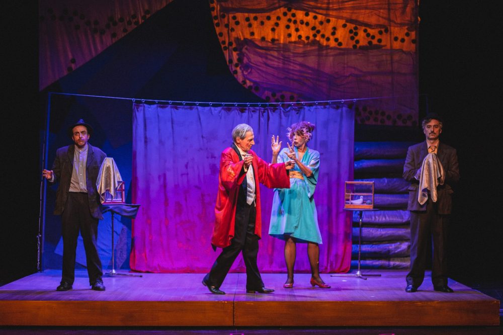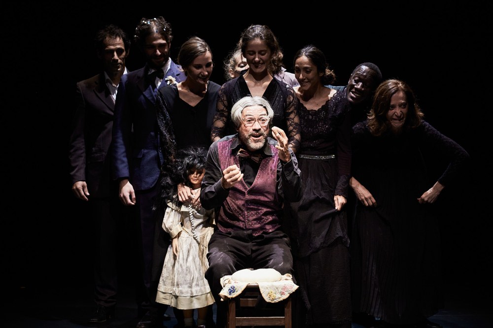Il testo di Eschilo, quasi un compendio di tutte le tragedie antiche, nella moderna versione di Walter Lapini, trova un adattamento ricco di spunti visivi di grande teatralità: il fondo del palcoscenico nella scenografia dello stesso Livermore e di Lorenzo Russo Rainaldi è una parete a specchio che riflette il pubblico sulle gradinate – anche noi siamo protagonisti della vicenda – ma incastonato nell’immensa parete c’è un video wall circolare, un altro è orizzontale sul pavimento. Gli eleganti costumi di Gianluca Falaschi richiamano gli anni ’30, con le donne in abiti lunghi, un sofà, mobili e carrelli colmi di coppe di champagne. È la fine della guerra e vecchi generali in sedie a rotelle vengono spinti da infermiere e infermieri che qui assumono il ruolo del coro e un doppio spettro di Ifigenia si aggira sul palcoscenico. Sul pavimento barchette di carta alludono alla flotta partita per distruggere Ilio. Tre pianoforti forniscono la componente sonora formata dal tema bachiano dell’Offerta musicale rielaborato da Diego Mingolla e Stefania Visalli assieme a violenti cluster suonati direttamente sulle corde del terzo pianoforte verticale. Il rosso cremisi è il colore che domina nella scenografia: l’abito di Clitennestra, i fiori caduti dall’alto che tappezzano il passaggio di Agamennone vittorioso, il sangue che sgorga dalle ferite degli assassinati.