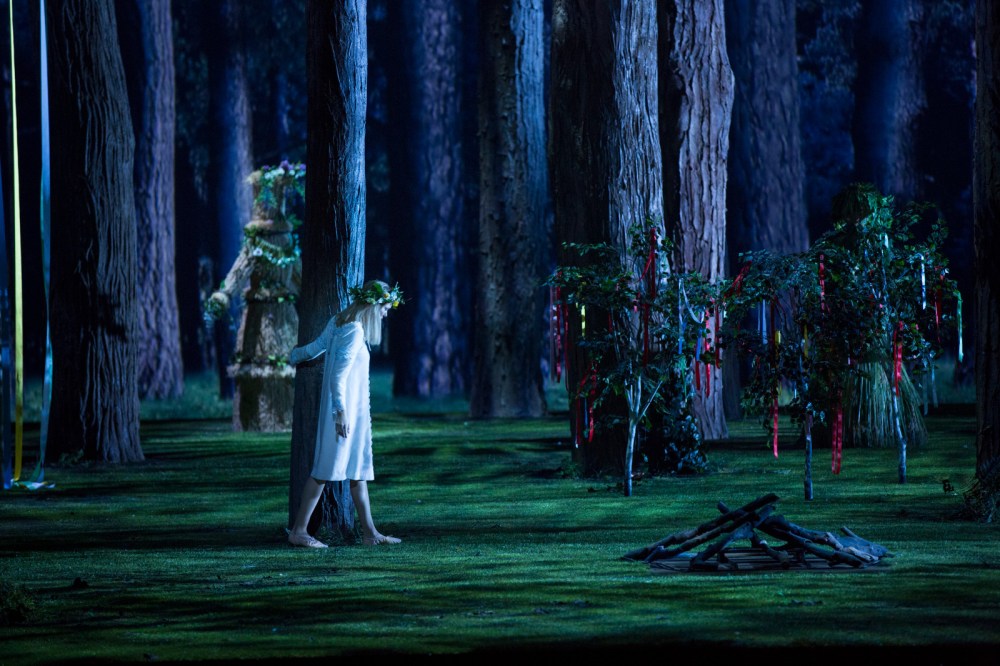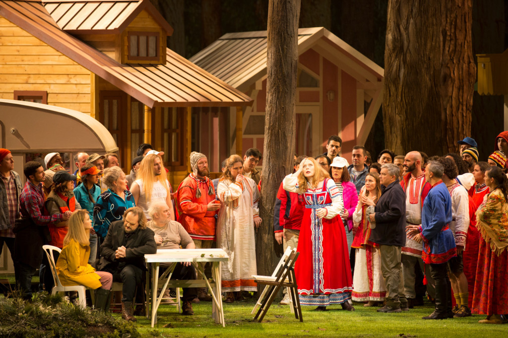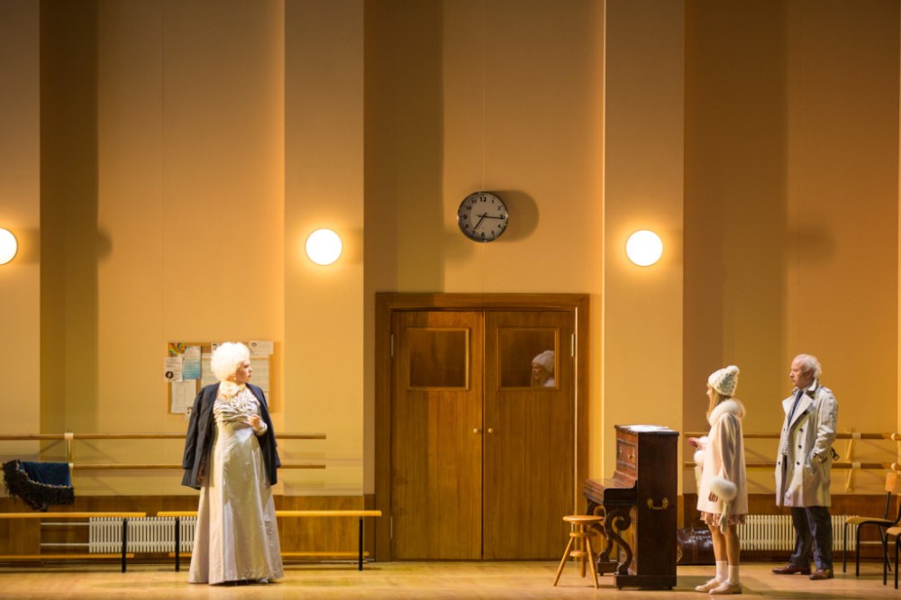 L’impianto scenografico di Antony McDonald (che disegna anche i costumi) consiste in una grande scatola lignea chiusa in cui si inserisce un elemento scenografico che forma l’interno borghese dei Kabanov (l’ambientazione è quella degli anni ’70 del secolo scorso). Ruotato su sé stesso diventa la casa vista dall’esterno, ossia dal giardino del secondo atto in cui si consuma l’incontro delle due coppie di amanti e dove un triste lampione illumina la scena occupata da una panchina. Il vecchio palazzo semidistrutto in cui si rifugiano quelli sorpresi dal temporale nel terzo atto qui diventa la pensilina di una fermata d’autobus e il fiume Volga verso cui lanciano le loro canne da pesca i giovani del villaggio è il golfo mistico. Le acque del fiume che inghiottono la sventurata nel fulmineo finale sono gli stessi abitanti che prima ignorano e poi condannano il suo comportamento («perché mi trattano così? Dicono che un tempo per le donne come me c’era la condanna a morte…») e che ora la travolgono come un’ondata di piena. Complesso il gioco luci di Lucy Carter, ma non perfettamente realizzato in alcuni momenti dello spettacolo. La lettura di Jones è apprezzabile quando sottolinea la diversità tra la ragazza e l’ambiente che la circonda, ma non è del tutto convincente nel finale: per tutto lo spettacolo il nervoso andirivieni dei passanti e di un ciclista hanno punteggiato l’azione e solo alla fine tutti lasciano finalmente il palcoscenico con il cadavere di Kát’a per terra su cui si curva il marito (ma il libretto dice invece che «parte agitato»), mentre la suocera da un lato è chiusa, forse, nel rimorso. Per lo meno così sembra dall’espressione di Susan Bickley, ma le sue ultime parole non lo facevano affatto intendere.