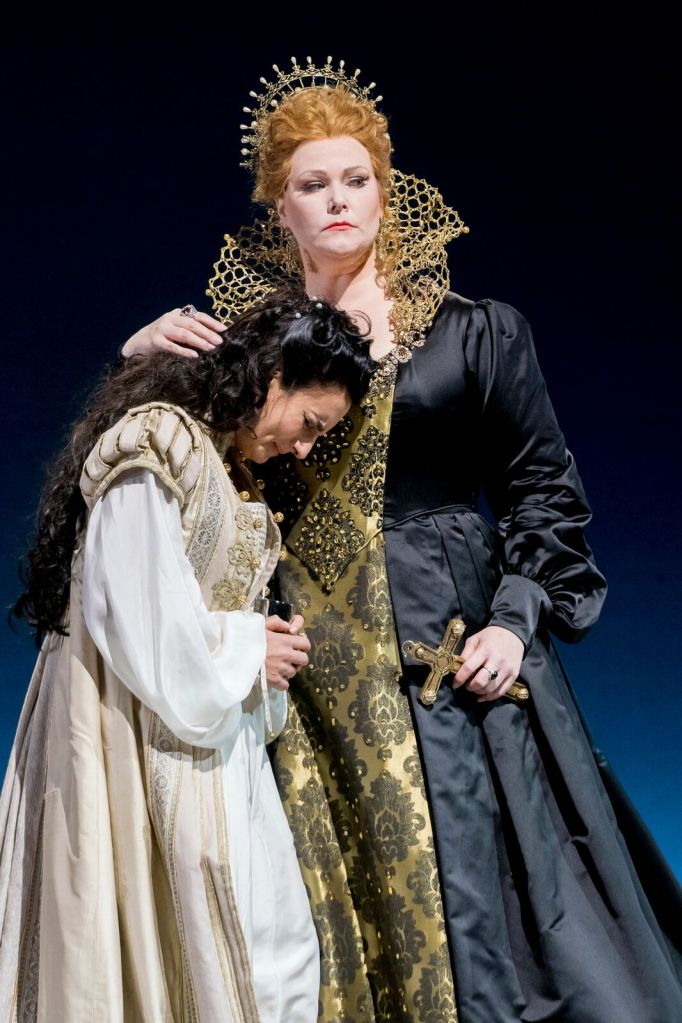 L’allestimento scenico è stato affidato a María Pilar Pérez Aspa, attrice spagnola alla sua prima esperienza di regia lirica, senza particolari intendimenti e con qualche ingenuità, soprattutto per il personaggio di Elisabetta di cui viene sottolineata l’innocenza giovanile (all’inizio viene presentata bendata ed eccitata come una ragazzina per gli abiti nuovi che scendono dall’alto), la regista si riscatta però con un efficace coup de théâtre nel finale: il reticolo della pedana inclinata, unico elemento previsto nell’impianto scenografico di Angelo Sala oltre alla gabbia semovente in cui viene rinchiusa Amelia, si solleva e diventa una grata che separa Elisabetta dagli altri. La regina abdica agli affetti e si rinchiude in una prigione dorata cui è destinata dal suo ruolo di sovrana. Disegnati con eleganza i costumi d’epoca di Ursula Patzak, soprattutto quello di Warney, un nero abito vescovile con croce dorata appesa al collo che cela un pugnale.
