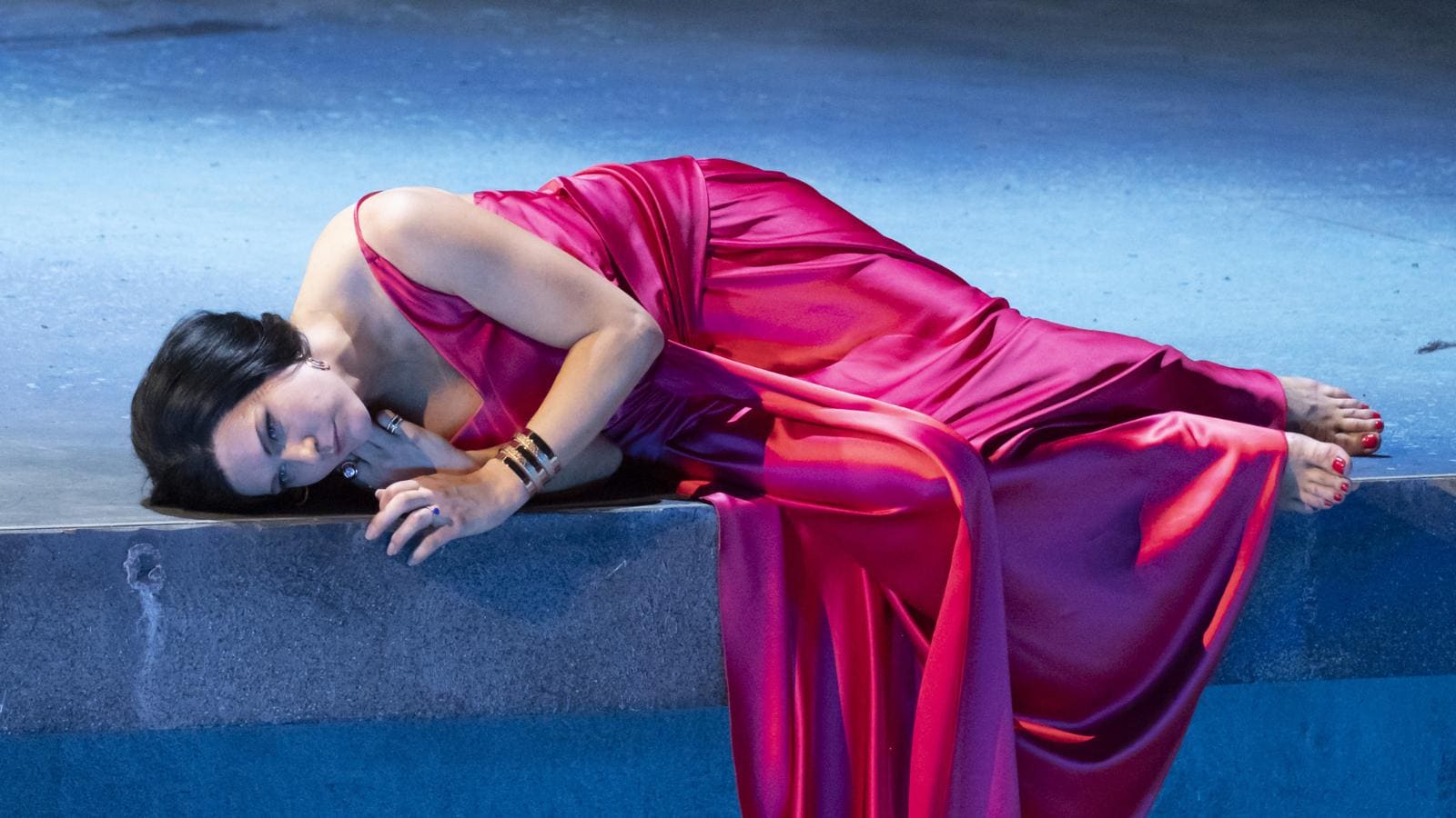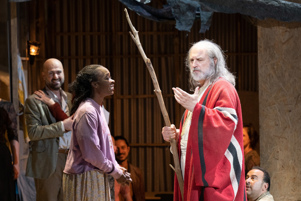 I personaggi passano da un ambiente all’altro, da quello dei capitalisti occidentali (l’Egitto di Faraone del libretto) a quello dei rifugiati (gli ebrei nell’attesa sempre delusa di partire per la Terra Promessa) nei primi due atti. Poi nel terzo la scena viene unificata e la parte sinistra diventa il palcoscenico per il balletto, un’efficace coreografia di Jeroen Verbruggen, con il pubblico degli invitati destra. Su uno schermo vengono proiettate immagini di catastrofi naturali per illustrare le piaghe mandate dal dio di Mosè agli egiziani. Nel finale, su una grande tela vediamo il Mar Rosso dividersi con gli egiziani (ossia noi occidentali con i completi scuri, le scarpe a spillo, i tailleurs…) sommersi da quelle acque vendicatrici – il rimando alle immagini dei migranti che fanno la stessa fine nel mar Mediterraneo non è certo casuale. Poi la tela si alza un’ultima volta per rivelare una spiaggia con bagnanti pigramente allungati sulle sedie a sdraio, occhiali da sole, un cocktail in mano o il telefonino. Gli ebrei sono nel frattempo scesi con i loro gilet arancioni tra gli spettatori della platea, ma sulla scena una delle bagnanti scopre sulla sabbia il bastone di Mosè che prima guarda con curiosità, poi getta con orrore, come se avesse percepito qualcosa di strano. Non c’è traccia di soprannaturale nella lettura di Kratzer: gli interventi divini sono le calamità che ci stiamo costruendo noi stessi: siccità, incendi, alluvioni, carestie, guerre sono il frutto della nostra incosciente azione sul pianeta che ci ospita. Così, anche le tenebre (prima piaga del libretto, quinta della narrazione biblica) sono causate da un black out dell’energia elettrica.