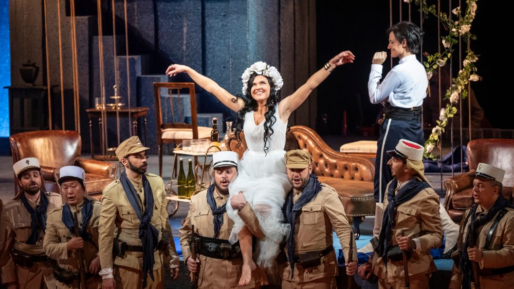 Ed è un salto nel tempo quello che ci fa fare il decano del teatro italiano: quello che vediamo in scena, pur con tutta la sua eleganza e perfezione formale, è uno spettacolo che avremmo potuto vedere cinquant’anni fa. Non che la cosa dispiaccia, ma di certo non è una lettura contemporanea: le problematiche suggerite dal libretto non sono prese in considerazione, la direzione dei cantanti/attori è quanto mai tradizionale, le stilizzate scenografie sono disposte in maniera rigorosamente simmetrica, così come le masse corali e i solisti nei concertati e anche il balletto, inevitabile in una versione per Parigi, rimane il solito momento avulso dalla vicenda. Vero è che ben pochi hanno cercato di inserire l’intervento coreografico nella drammaturgia dell’opera: vengono in mente i nomi di Graham Vick e Damiano Michieletto nei loro Guillaume Tell, rispettivamente nel 2013 a Pesaro e nel 2015 a Londra, o di Valentina Carrasco in Les vêpres siciliennes (Roma, 2019). Per non parlare dell’approccio al problema risolto da Bob Wilson in maniera del tutto radicale e spiazzante nel suo Le trouvère (Parma, 2018).