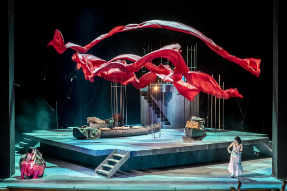 Messa in scena sgangherata quella di Jürgen Flimm, che sembra voglia trattare con ironia la vicenda, ma le sue intenzioni non sono chiare e ogni interprete si costruisce un modo recitativo tutto suo senza pensare all’insieme. La scenografia di Magdalena Gut consiste della solita piattaforma rotante, qui sollevata, con sopra una quantità eterogenea di oggetti: un frigorifero, una scrivania impero, un ventilatore, un salotto in cuoio, valigie, delle barche, una betoniera rossa, mattoni di plastica trasparente, strutture di ferro tubolare per piloni di calcestruzzo (Cartagine in costruzione?), una specie di torre. I costumi, raffazzonati anch’essi, di Kristina Bell suggeriscono un passato coloniale tra le due guerre.