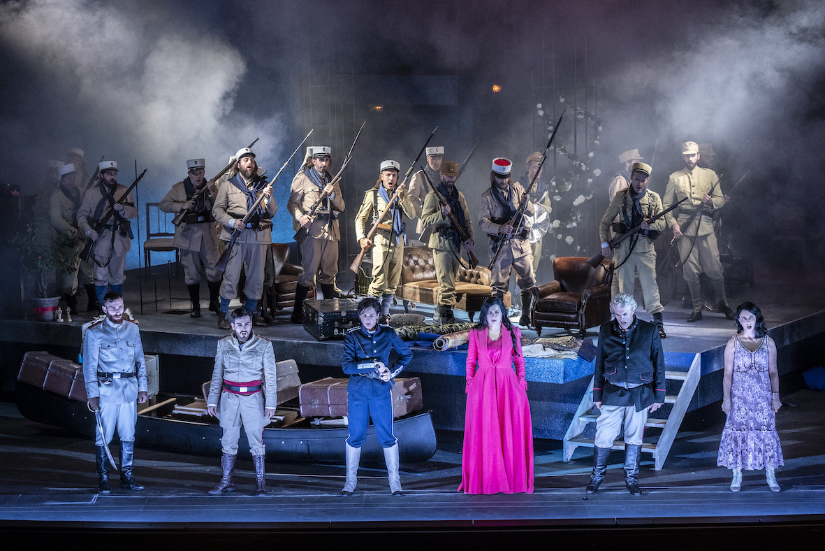 Musica che si rivela sorprendente per bellezza e originalità: a momenti viene il sospetto che il Maestro Corrado Rovaris, che dirige l’Orchestra Donizetti Opera, si sia divertito a inserire pagine estranee, ma il fatto è che alcuni momenti richiamano un Rossini a venire – c’è infatti l’inno che troveremo nel Viaggio a Reims! – tanto è felice l’invenzione tematica e strumentale della partitura messa sapientemente in risalto dalla sua concertazione. Gli scatti ritmici delle marcette (alcune suonate da una grande banda in scena), i solenni toni degli inni, lo slancio delle cavatine, i colori degli strumenti, le gemme melodiche, la raffinata armonizzazione, tutto è reso con mano felice e l’equilibrio tra buca e voci sul palco viene mirabilmente realizzato. (1)