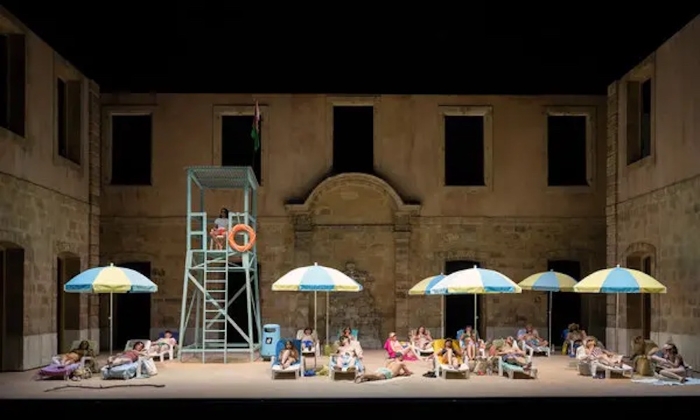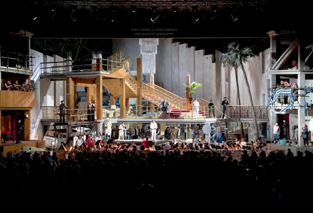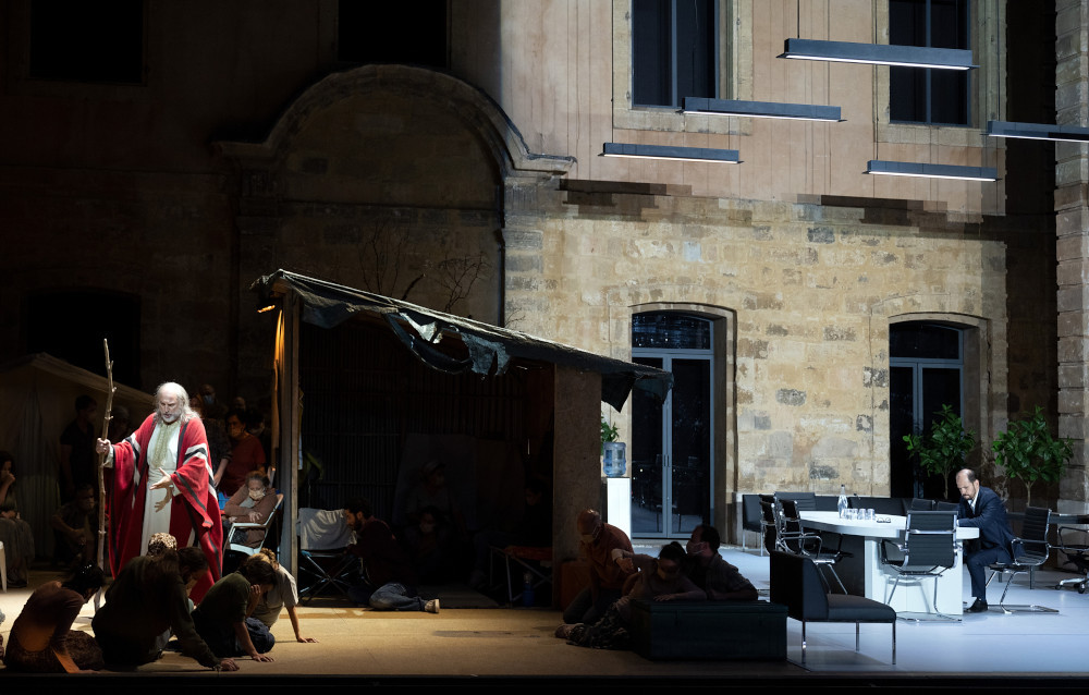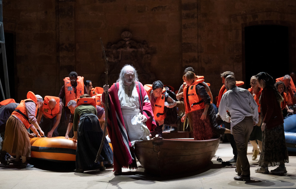 Terzo spettacolo lirico del Festival di Aix-en-Provence, il lavoro di Rossini viene messo in scena con grandi mezzi nel cortile dell’Archevêché. La regia di Tobias Kratzer ambienta la storia ai nostri giorni – ce ne rendiamo conto dopo un attimo di smarrimento all’apparizione di un Mosè tale e quale quello del film di DeMille The Ten Commandments (1956) – con il vasto palcoscenico diviso in due: a sinistra (côté jardin, come dicono i francesi) un campo profughi con la tenda dell’infermeria, a destra (côté cour) gli ambienti lussuosi e asettici dei potenti. Sul fondo è ricostruita la Fontana d’Espéluque, quella nella antica Place de l’Archevêché (ora Place des Martyrs de la Résistance), per rammentarci l’hic et nunc della vicenda. La scenografia di Rainer Sellmaier (suoi anche i costumi) è sapientemente illuminata dalle luci di Bernd Purkrabek.